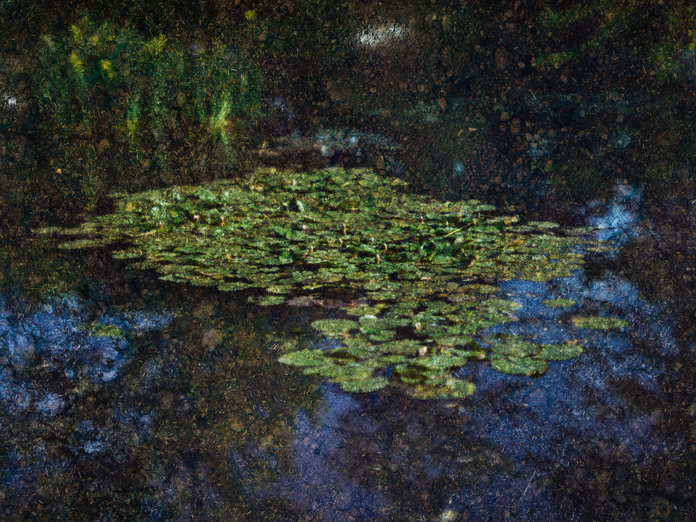 Like ancient navigators, wayfinding by stars and lines of the land, viewers move among images that compound the sky and the earth in a new topology. The water lilies of Monet may have become a cliché of art history—but Morell’s optical technology complicates the picture enough to make them surprising again.
