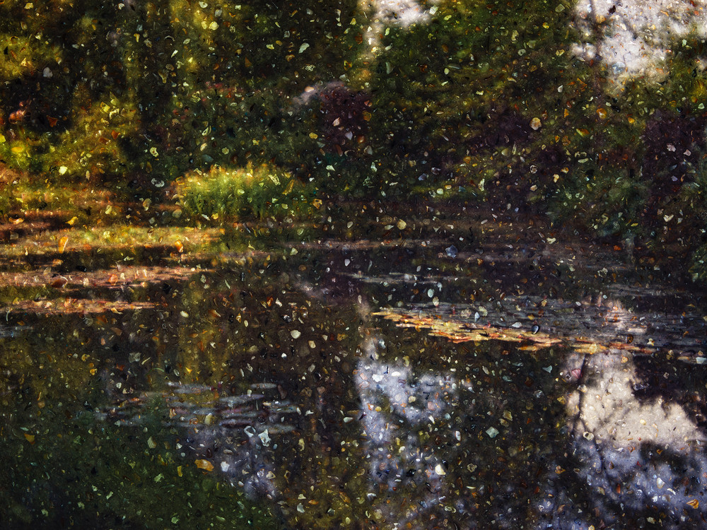 In fact, the notoriety of Morell’s chosen subjects play to his favor. The familiarity of impressionist landscapes works like collective memory, supporting and filling in the composition. The image shifts dramatically as you step backwards, the fine grained focus on the ground slips away, and the overall shapes of the landscape emerge. The path stones turn to falling snow, or leaves, cascading through the trees, reflections and lilies. The polished stones are reminders of crowded modern life within this otherwise idealized landscape.