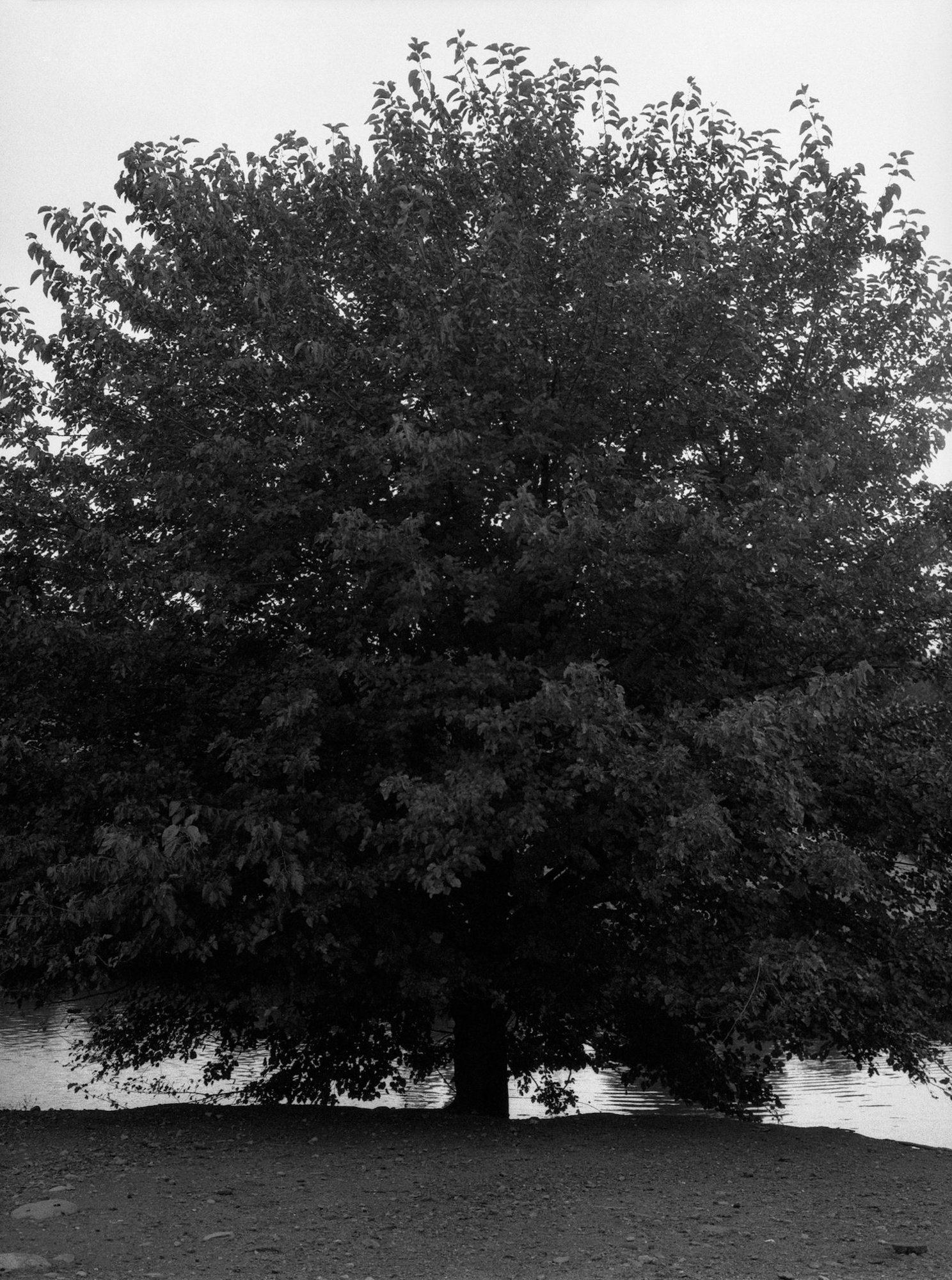 There are photographs that walk a line between formalism and abstraction, a spindly crack in the pavement that brings to mind an aerial view of the course of a river or the wet patch on a playground’s blacktop that reflects the sun like liquid mercury. These more detail oriented images create an aura of the space as if the viewer could reach out and trace the crack or feel the humidity left in the air after summer rain. The willow tree reappears later on, its branches caught in a gust of wind.