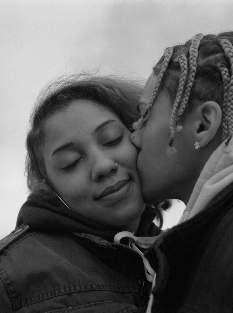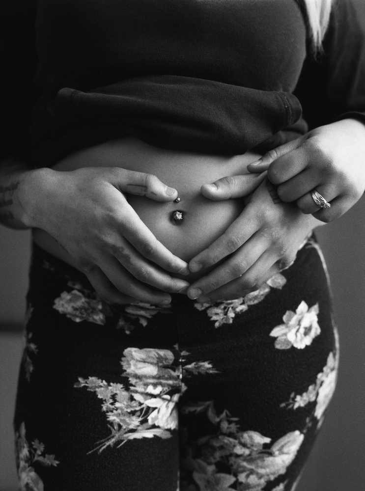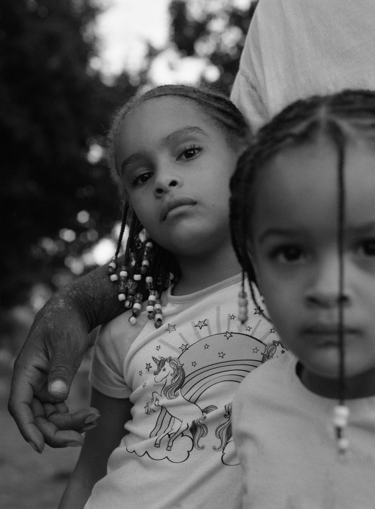 It is in the portraits though that Thompson’s work truly sings. A shirtless, muscular man tilts his head ever so slightly, the vulnerability in that small gesture speaking volumes. A shirt raised above floral pants where two hands frame a belly are met by the light brush of a third, echoing back to the hand of a woman resting on the flowered skirt against her thigh. The theme returns in an image of two young children, observing the viewer, as an adult’s hand lays protectively around their shoulders. Some portraits show reserve and at points guardedness. There are flashes of laughter. And yet the overarching emotions are tenderness and connection. This type of relationship to the community, the landscape, the work itself was summed up by Thompson when he told me that “a lot of these images are my favorites, each of them are my babies but I can’t love one more than the other. They are a part of me.”