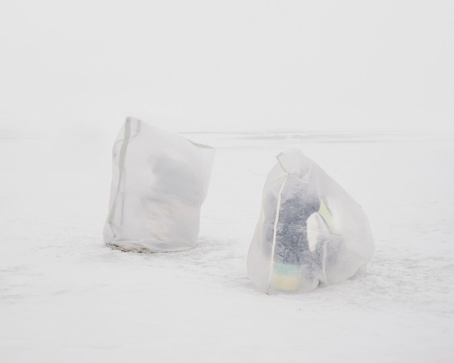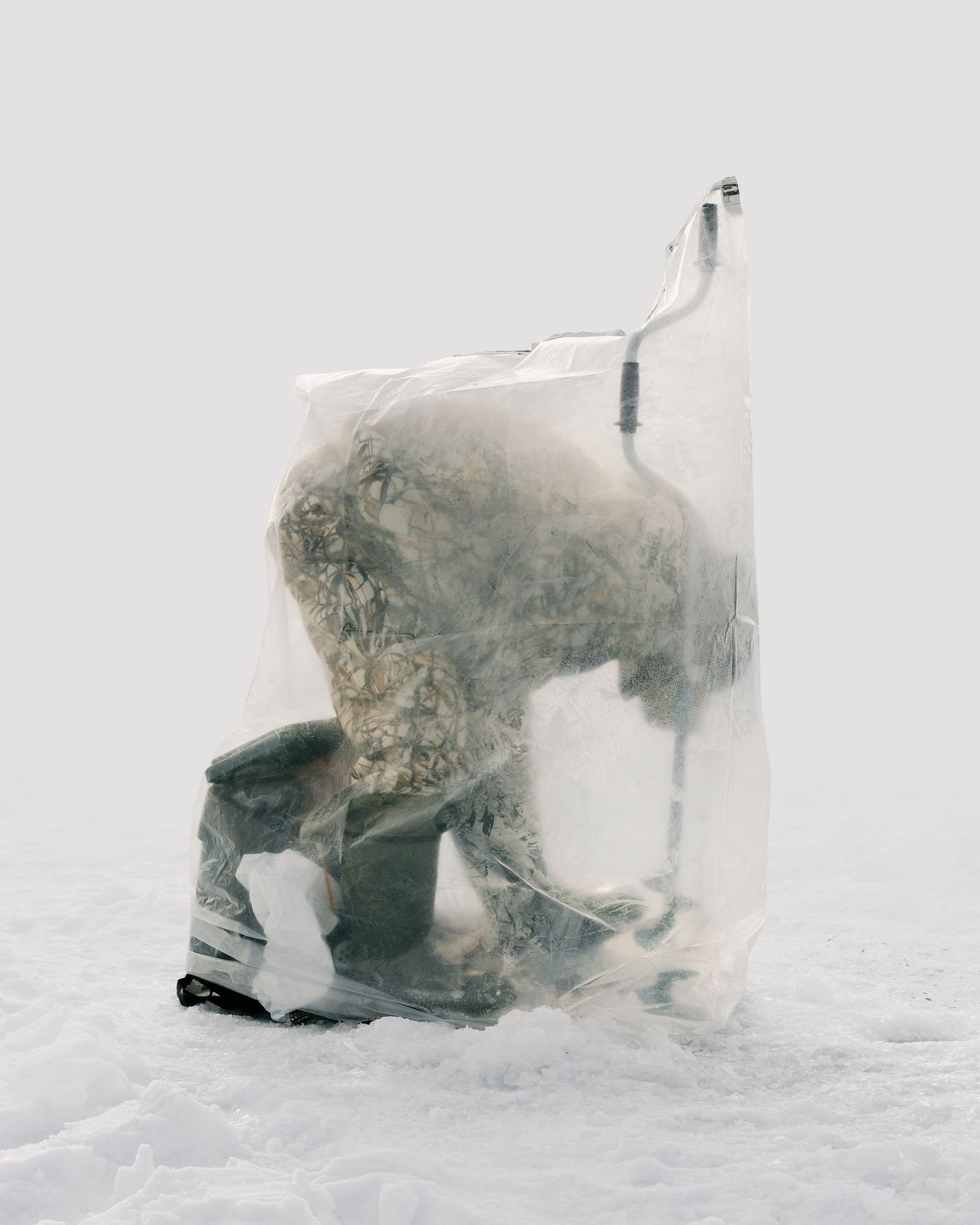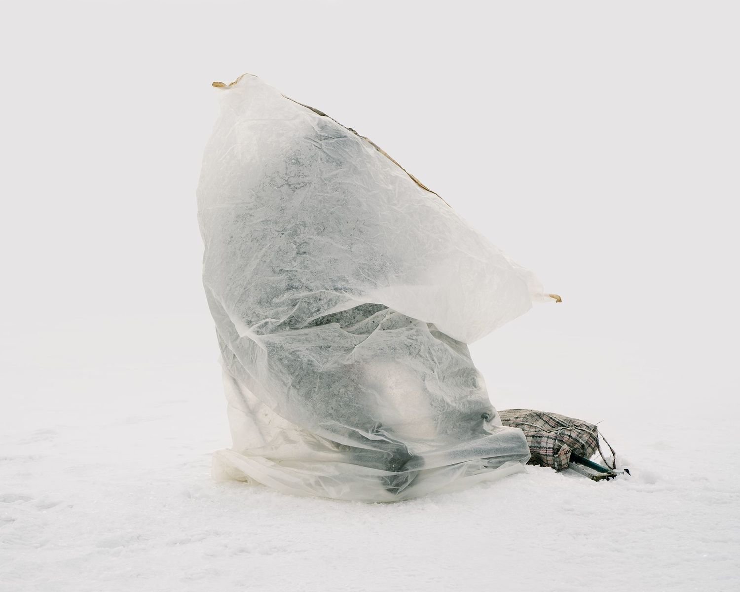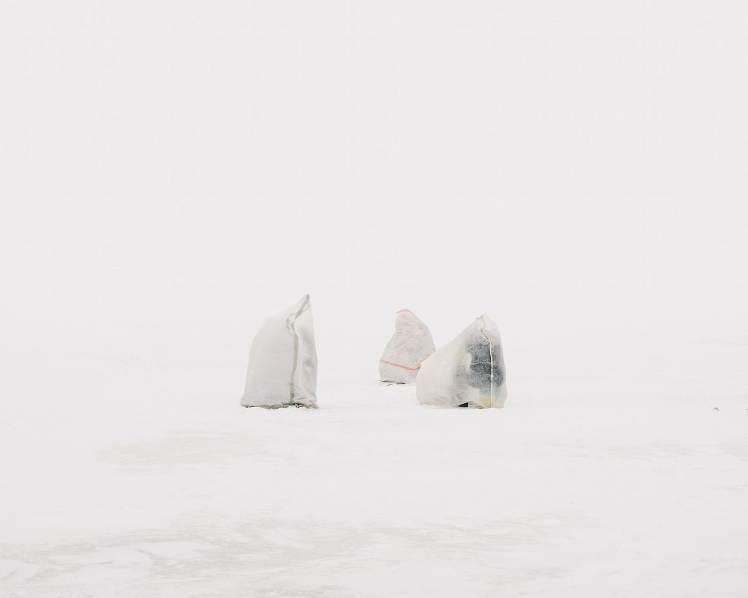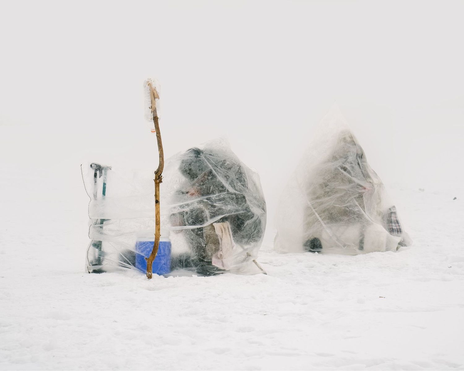 I was interested in examining the aesthetic forms of these improvised protective coverings and the way in which they function as inadvertent sculptures. I chose to focus on the materials and their surfaces as signifiers of underlying global influence and the improvisation that occurs from economic necessity. Kazakhstan was once a nomadic country, and vestiges of that way of life still exist despite the country’s embracement of modernity. These ice fishers improvise and adapt to their environment in ingenious ways, just as their forebears did.