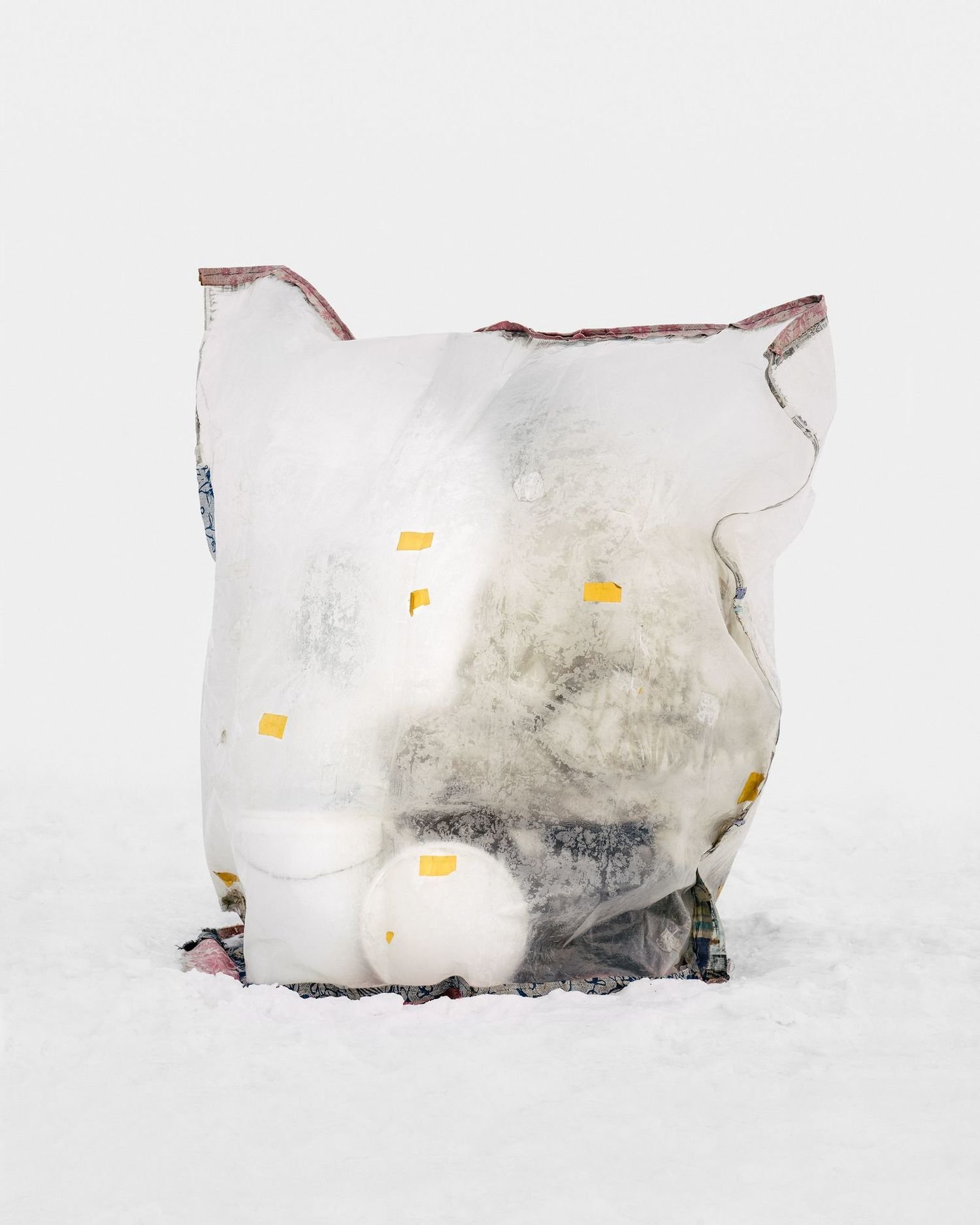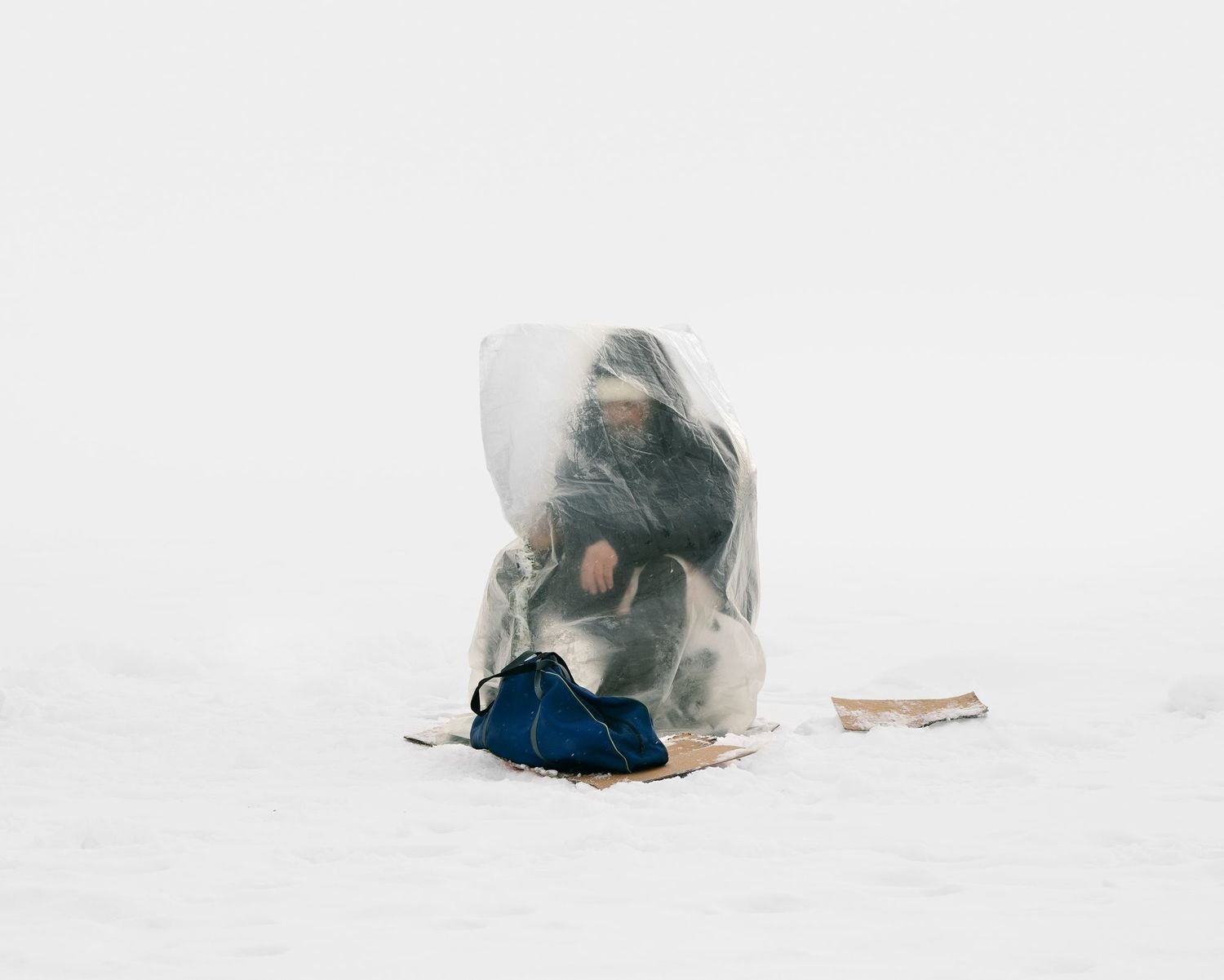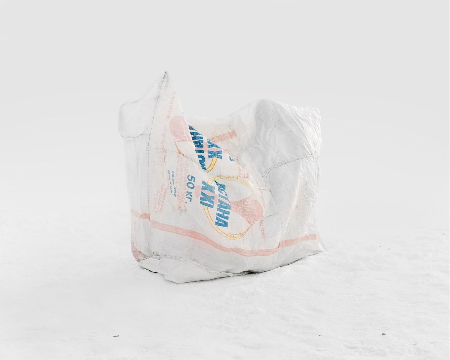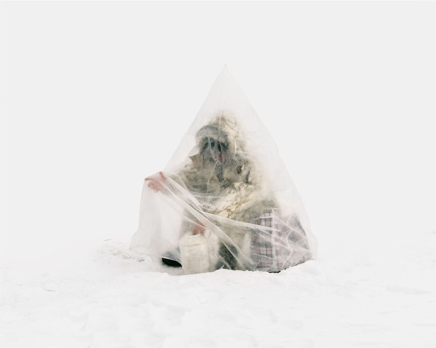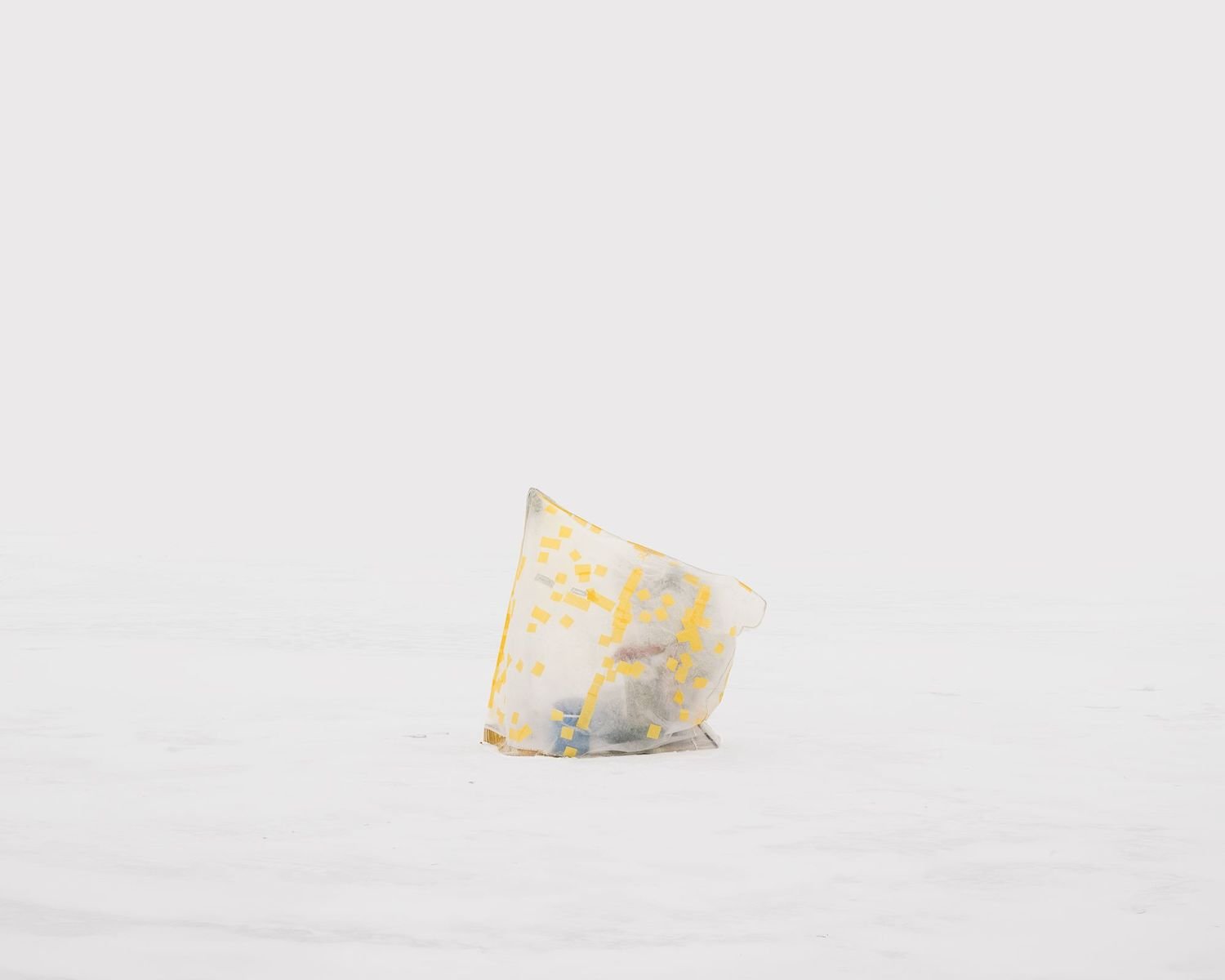 I was interested in examining the aesthetic forms of these improvised protective coverings and the way in which they function as inadvertent sculptures. I chose to focus on the materials and their surfaces as signifiers of underlying global influence and the improvisation that occurs from economic necessity. Kazakhstan was once a nomadic country, and vestiges of that way of life still exist despite the country’s embracement of modernity. These ice fishers improvise and adapt to their environment in ingenious ways, just as their forebears did.