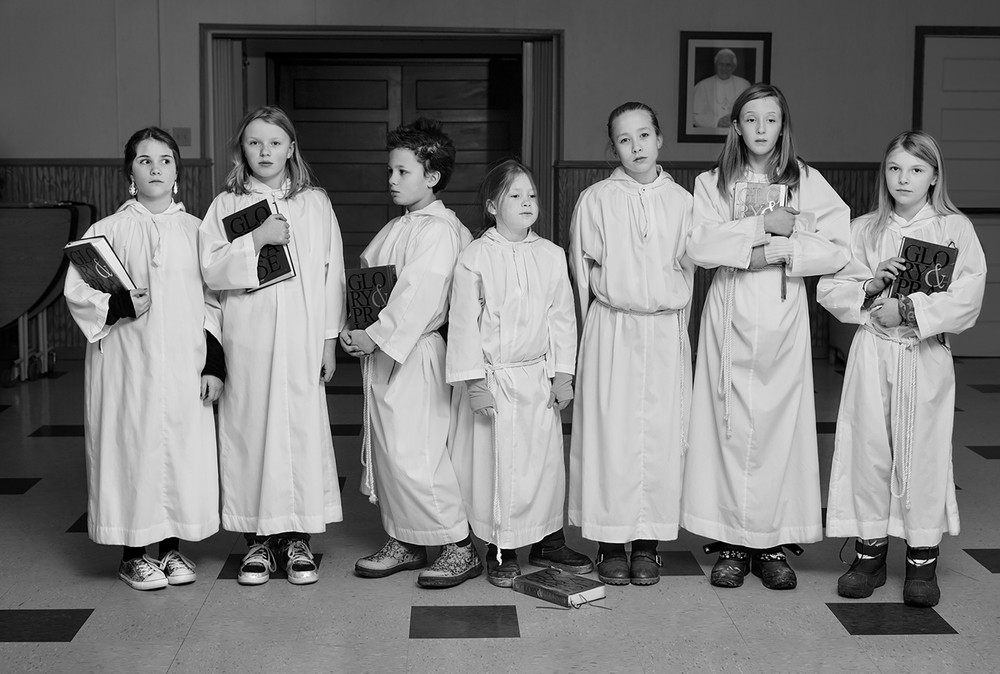 The photographer’s feeling of “dread and wonder” infuses the portraits in the book, which are both awkward and affectionate. A sensitivity to the in-between states of adolescence, present in many of Sanguinetti’s projects, is drawn into sharpness when interlaced with pictures of the town’s older residents, the energy and metamorphosis of youth simmering beneath the book’s icy surface. From the group of girls posing stiffly in their choir outfits to the teenage boy, alone seated at a piano, to the doe-eyed girl dressed in a bejeweled white gown, face framed by curls, a sense of performance runs through the pages, building up to give the sequence its own stilted rhythm.