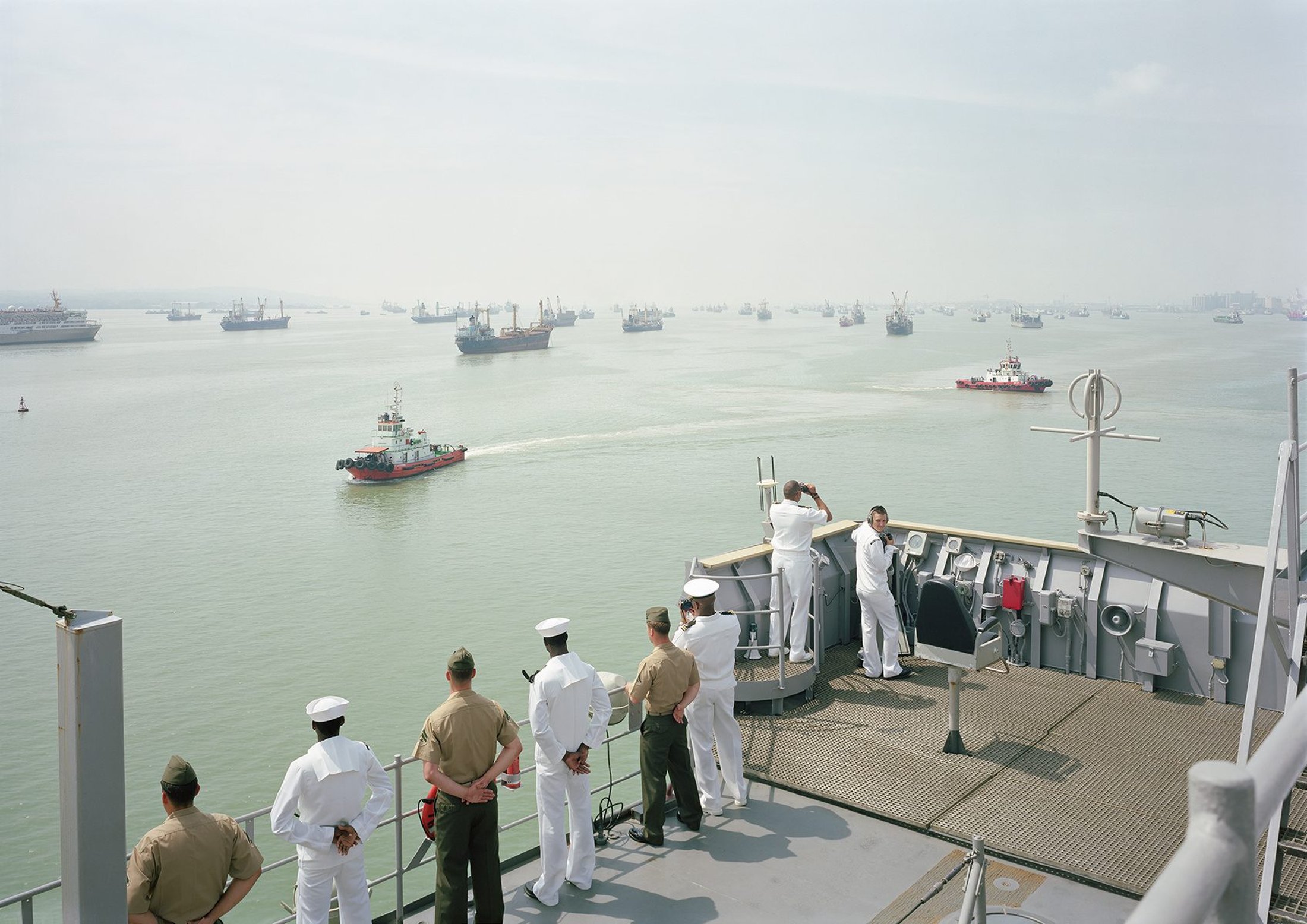 Besides the book’s form, befittingly expansive for the world’s most powerful naval force, the images themselves are equally unambiguous: an airy and immaculate palette, each shot framed to perfection using a Deardorff large-format camera. Each photograph bespeaks a naval force’s confidence in its professionalism and sense of duty, and a human landscape of loose-limbed personnel engaged in peacetime activities. Human interest is kept at a distance and with an absence of close-ups of faces; the figures remain anonymous. For example, in ” Target Practice, USS Peleliu” the sailors become strangely co-existent with the outlined figure that make up the target boards they are shooting at.