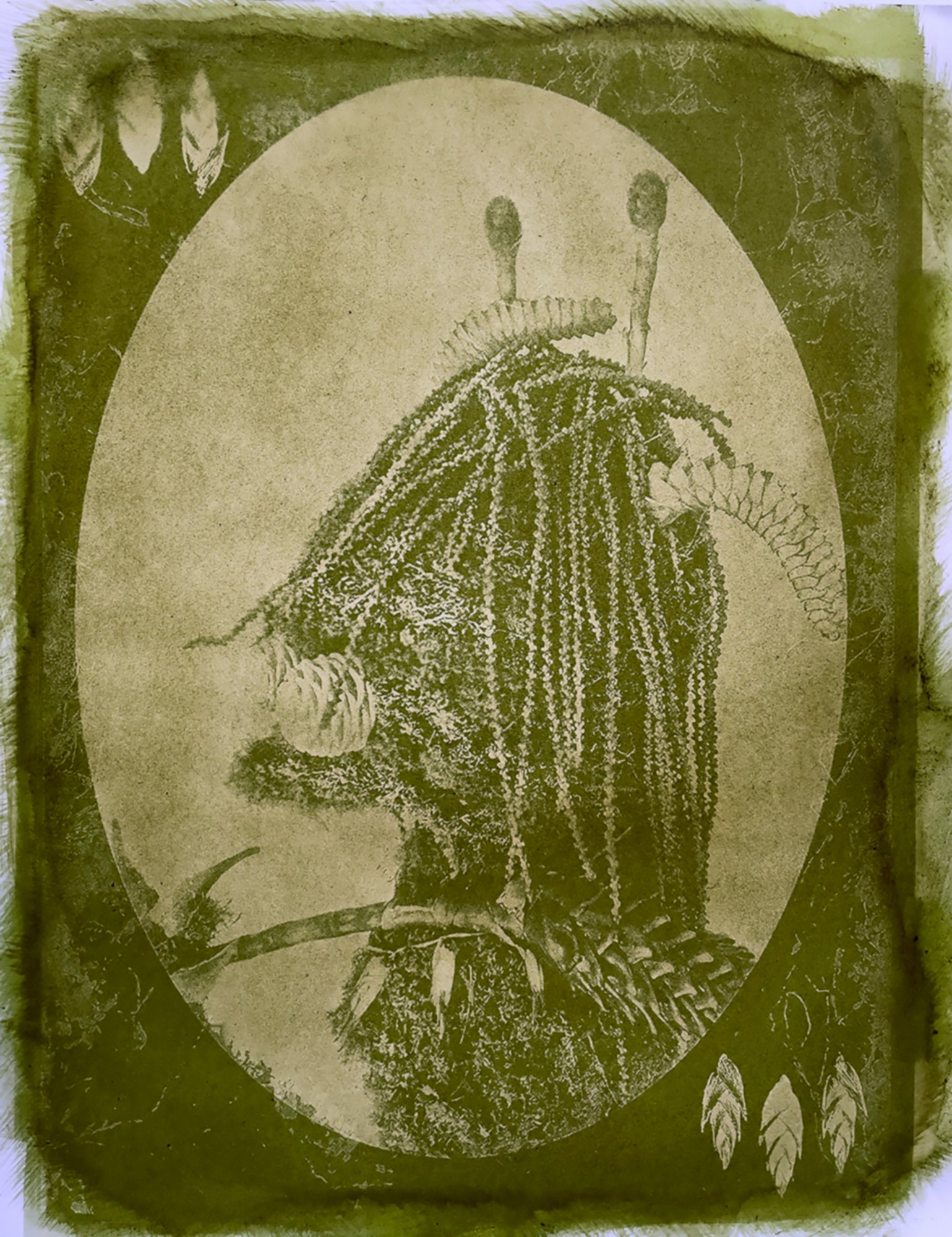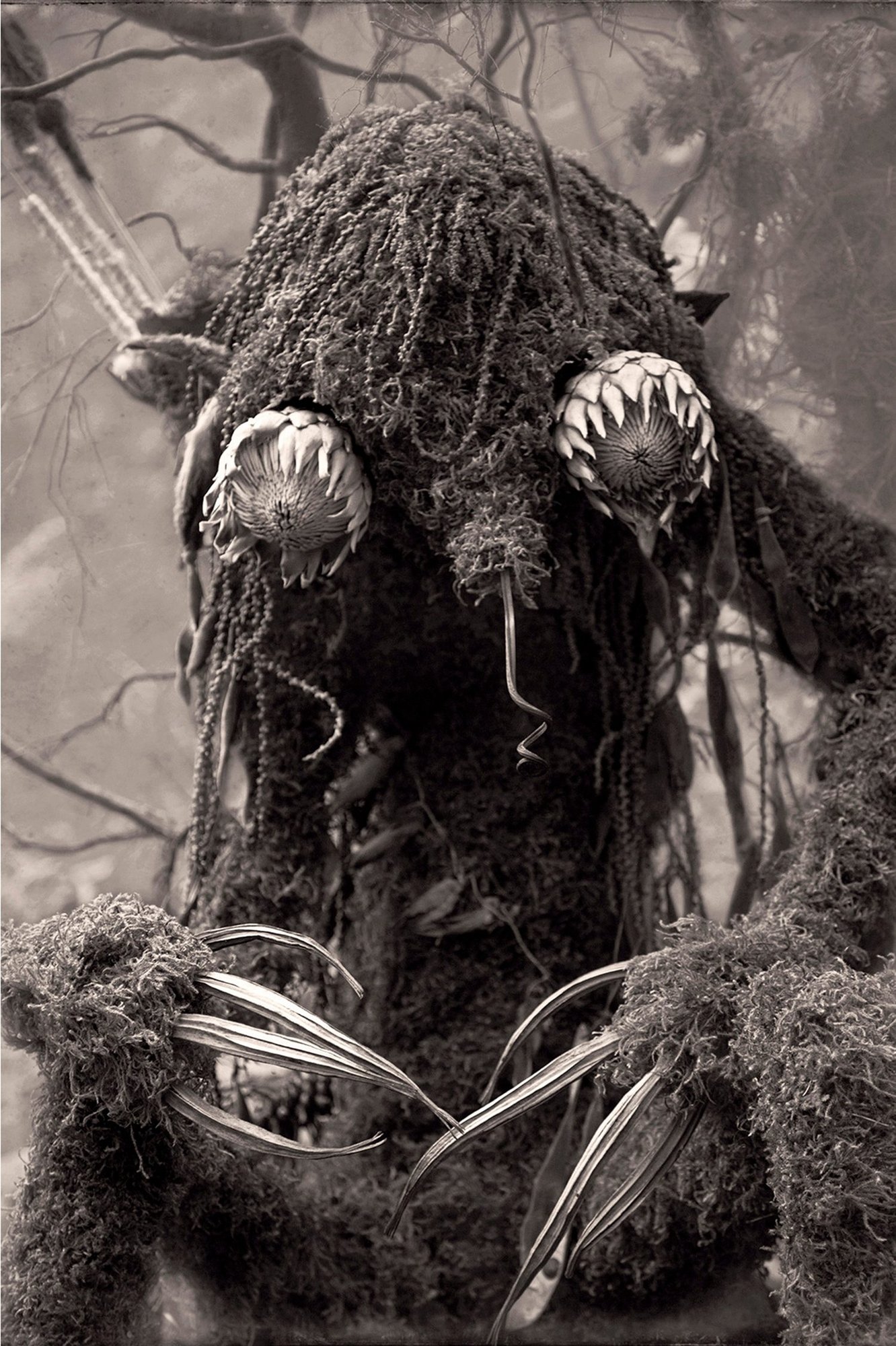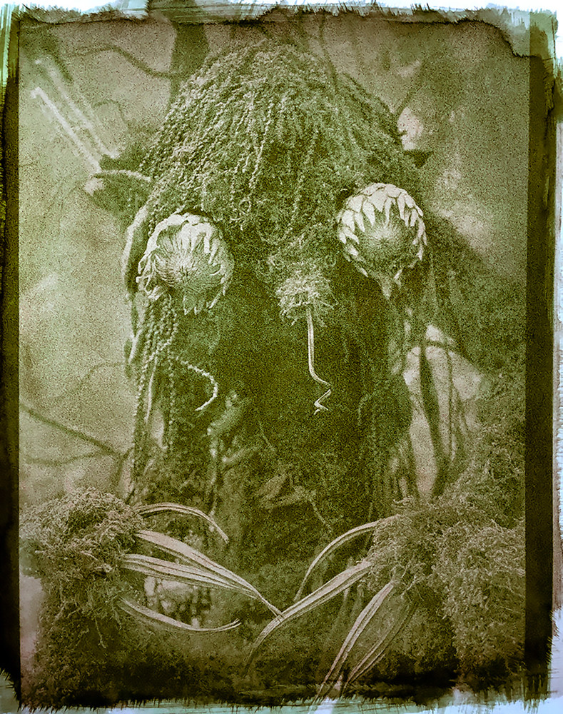 The exhibition invites visitors into a fairytale, built from the artist’s woodland scavenging adventures. Within this immersive installation, we first notice two larger-than-life creatures that seem to have materialized from wood, wire, bone, moss, and other plants. Indicating a narrative thread that extends beyond the gallery, a dozen palladium prints of varying sizes portray similar creatures, while others depict the raw foraged materials from which they are made. Created using light-sensitive paper coated with palladium salts, these prints both highlight the artist’s dedication to craftsmanship while providing a narrative bridge between the images and objects within the exhibition.