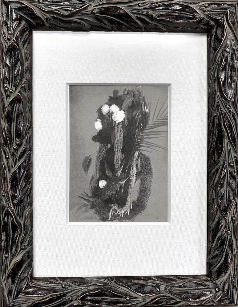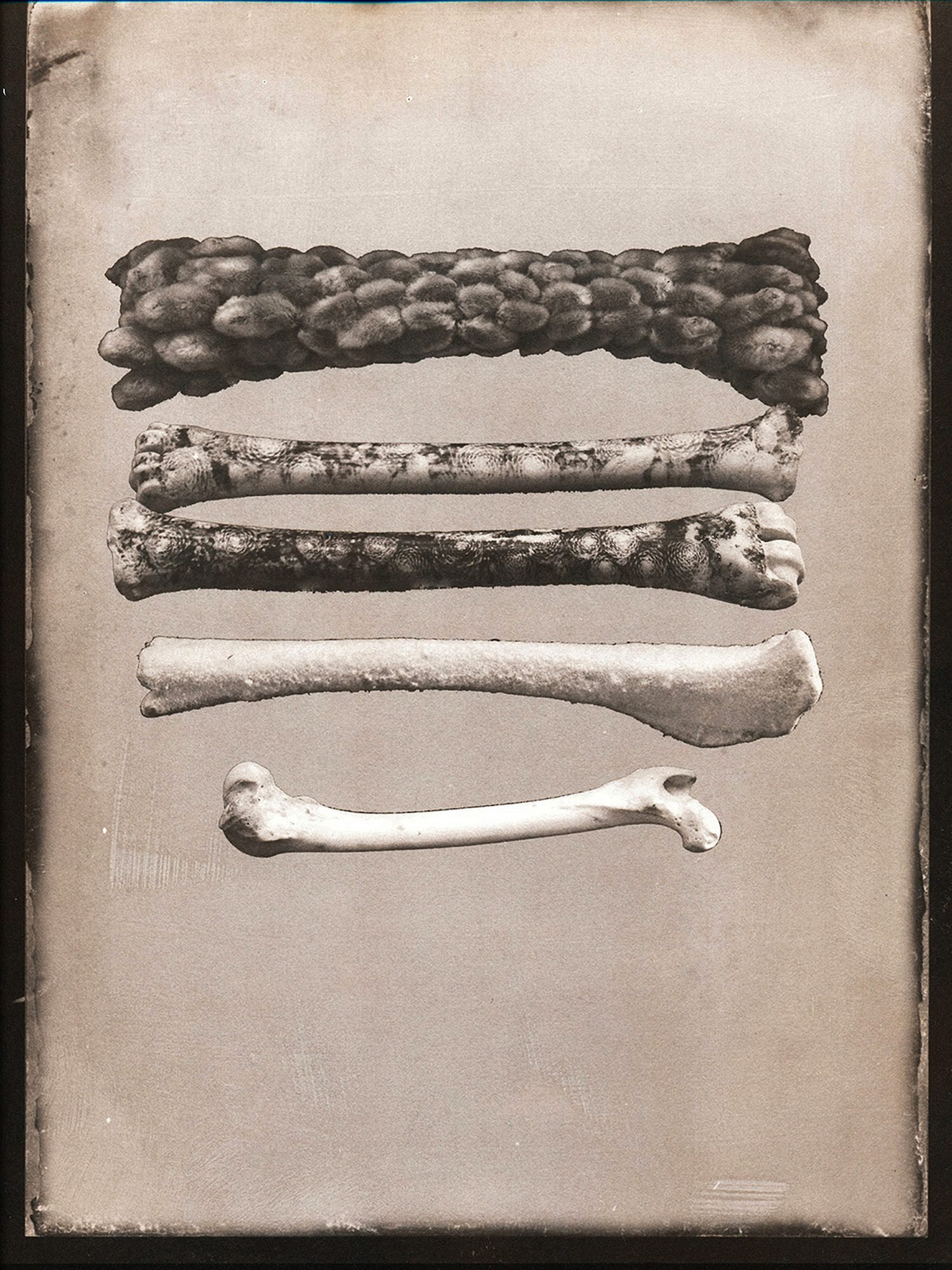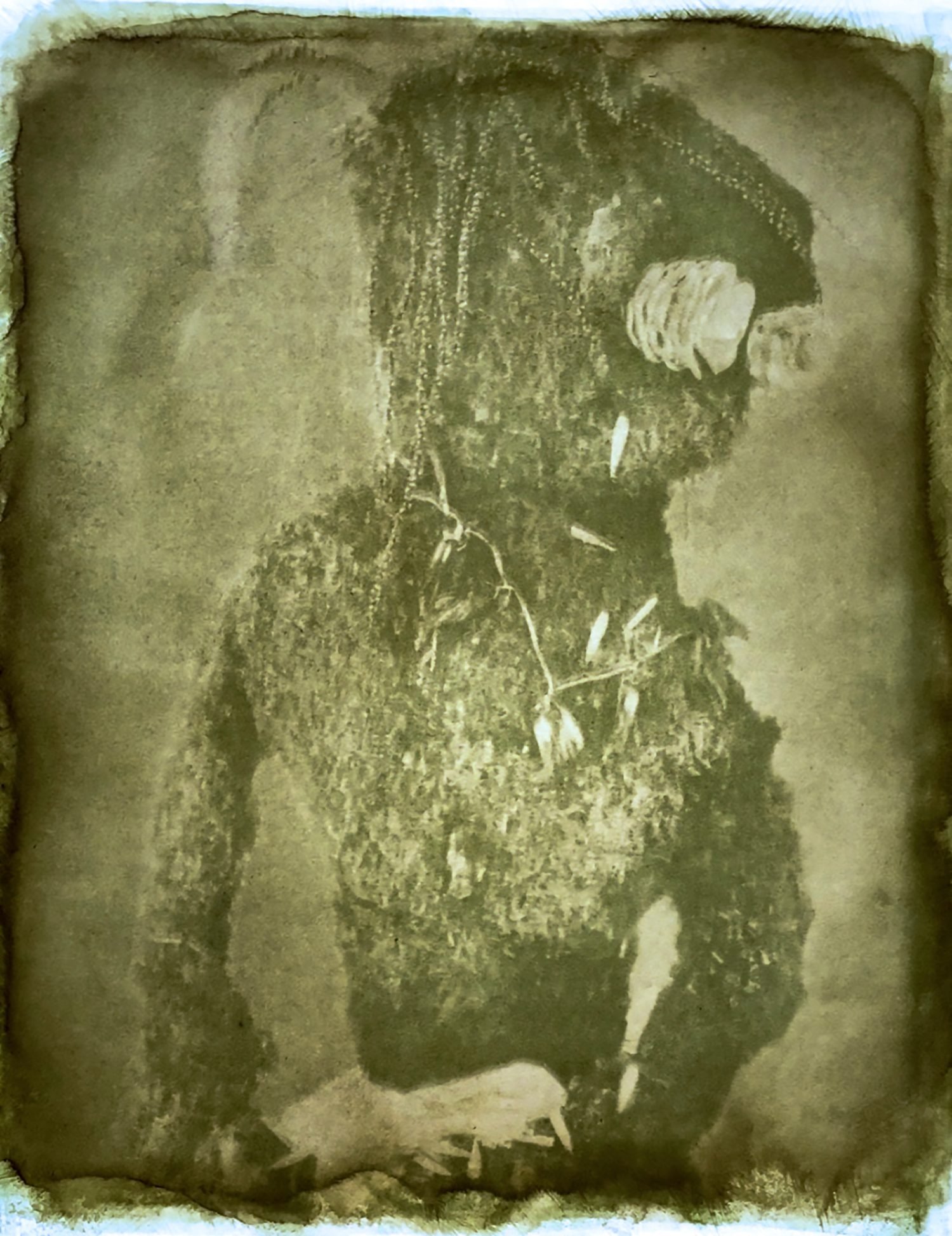 The exhibition invites visitors into a fairytale, built from the artist’s woodland scavenging adventures. Within this immersive installation, we first notice two larger-than-life creatures that seem to have materialized from wood, wire, bone, moss, and other plants. Indicating a narrative thread that extends beyond the gallery, a dozen palladium prints of varying sizes portray similar creatures, while others depict the raw foraged materials from which they are made. Created using light-sensitive paper coated with palladium salts, these prints both highlight the artist’s dedication to craftsmanship while providing a narrative bridge between the images and objects within the exhibition.