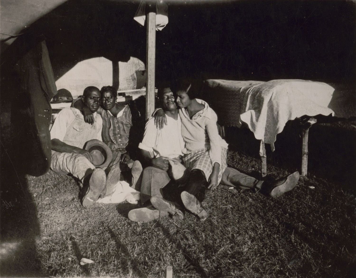 In one corner of the black and white image, shot by an unknown photographer near Washington, D.C. in 1920, a hooded Klu Klux Klansman looks towards the camera. In the center, men in dark suits—initiates to the group—kneel before a crowd of Klansmen and a blazing cross.