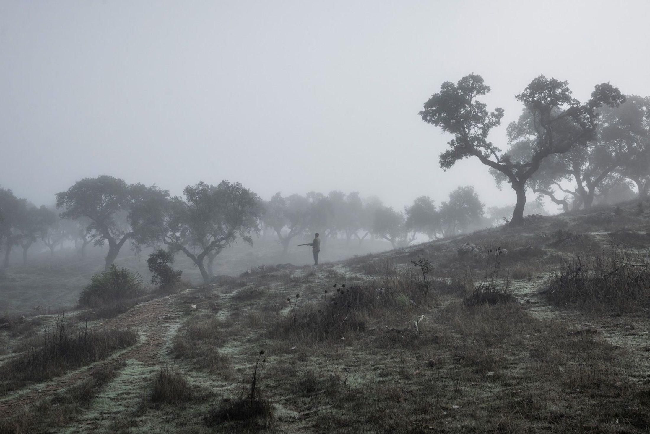 It was with this cliché in mind that I went to Alentejo, south of Portugal, in search of the contemporary hunters. For several months I saw deer, wild boar, foxes. I photographed popular hunting and private hunting estates, wealthy and middle class hunters, meat hunters and trophy hunters. I photographed those who live from hunting and those who see it as a hobby for a few weekends during the year. I followed the different times and moments of a hunt, in between the prey and the pose, wine and blood, the crack of gunfire and the murmur of the fields .