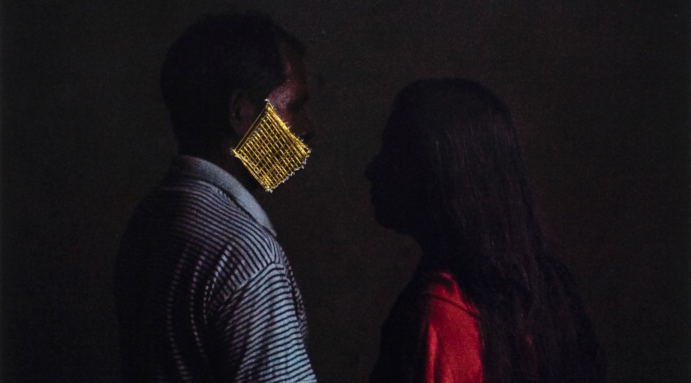 The presence of physical torture is hinted at but the dark scenes resonate with silence. Her subjects are half visible, lurking or emerging from isolation. Mouths sewn over by gold thread and handwritten notes reach to tell the viewer what the voice can no longer speak. The weight of gold is symbolic, prioritizing the law over the voice of the individuals that have suffered.
