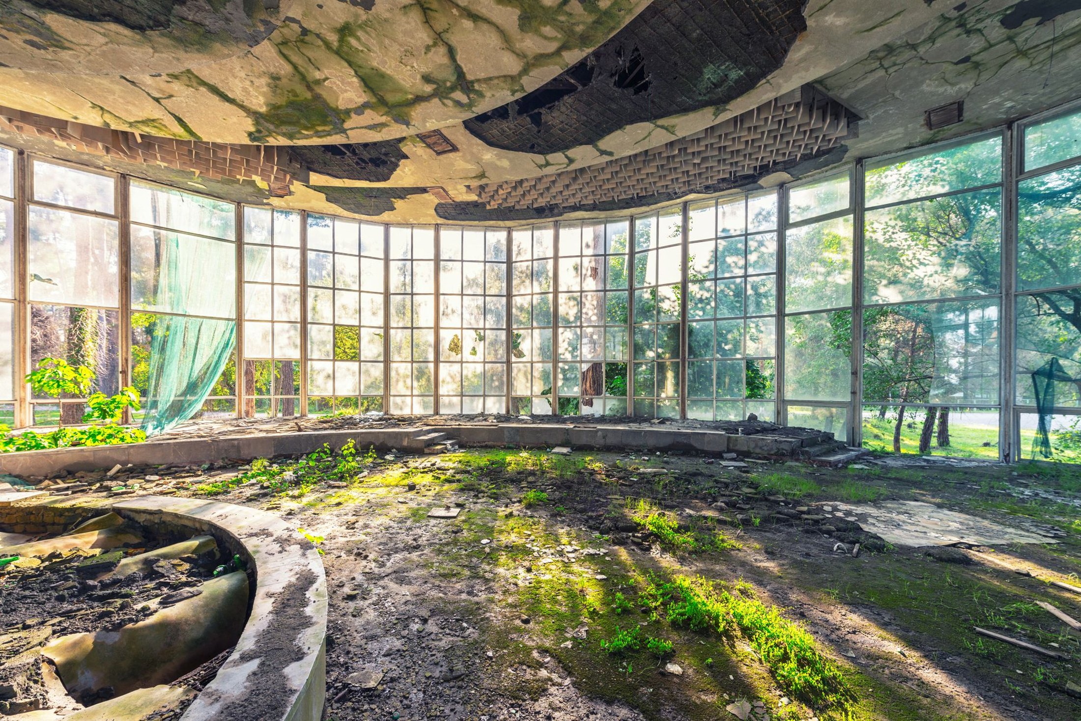 The first series, ”Topophilia—Abkhazia,” presents an almost surrealist glimpse at the region; monumental, ornate spaces are now decrepit and hollow, and many rooms seem to hang, impossibly, over the sea.