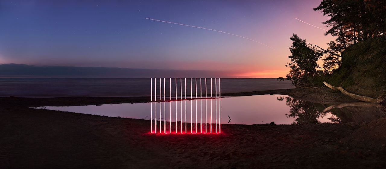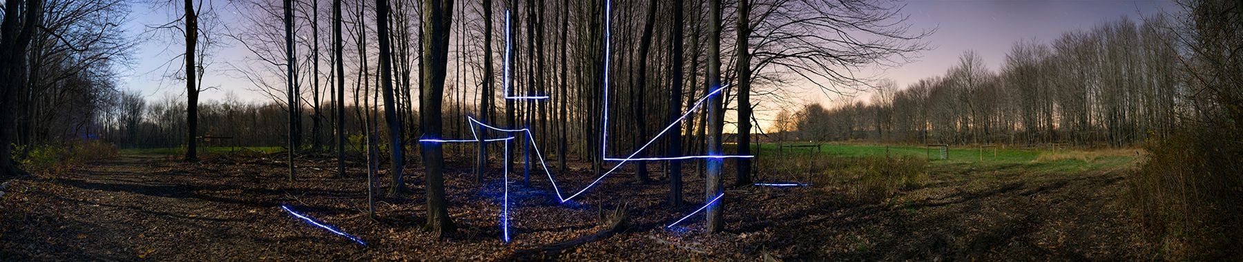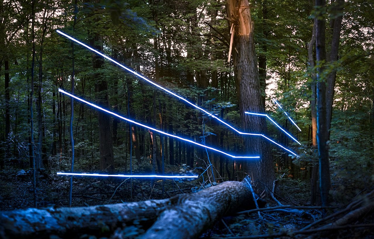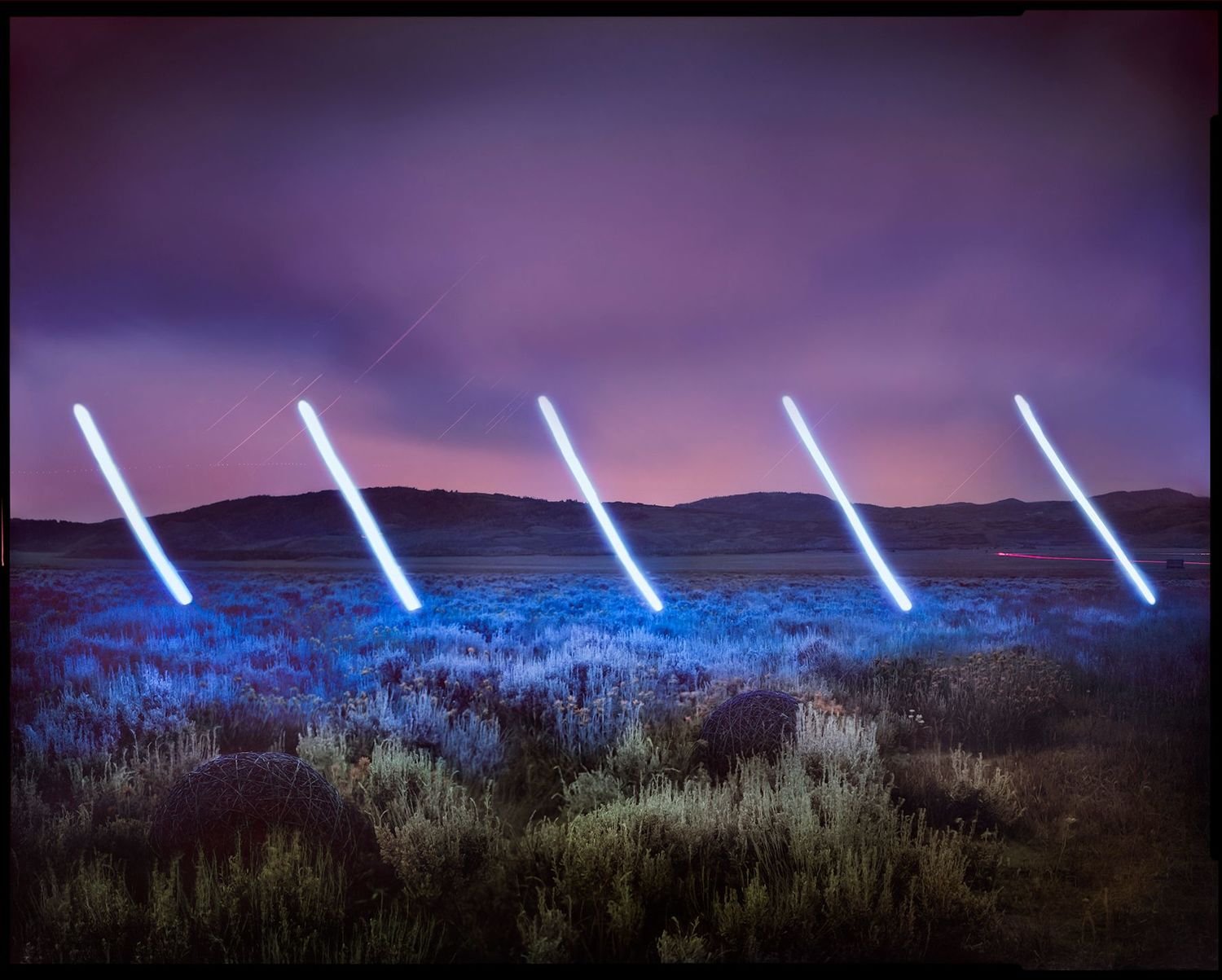 My work titled is a series of long-exposure photographic images of sculptural structures I build on-site in specific landscapes. I construct these tableaux by immersing myself in a given place, researching and instinctively reading the terrain, and then marking the site using foreign materials (LED lights, luminescent substances, and other physical processes) to emphasize and call attention to environmental blight. In the final prints, lights and sculptural alterations appear as intrusions.
