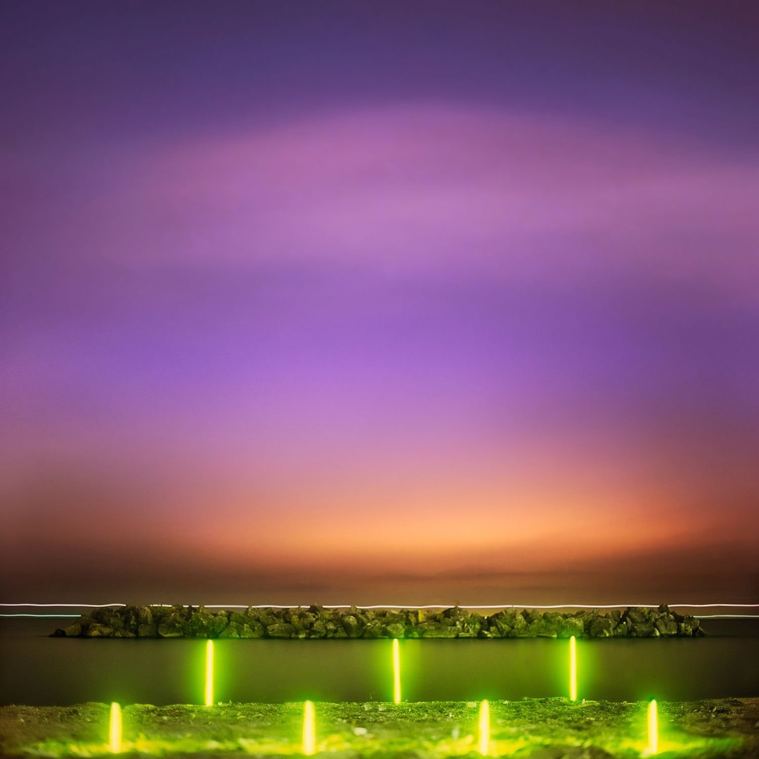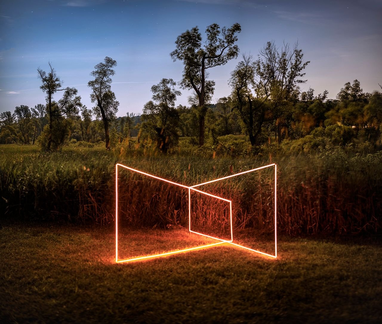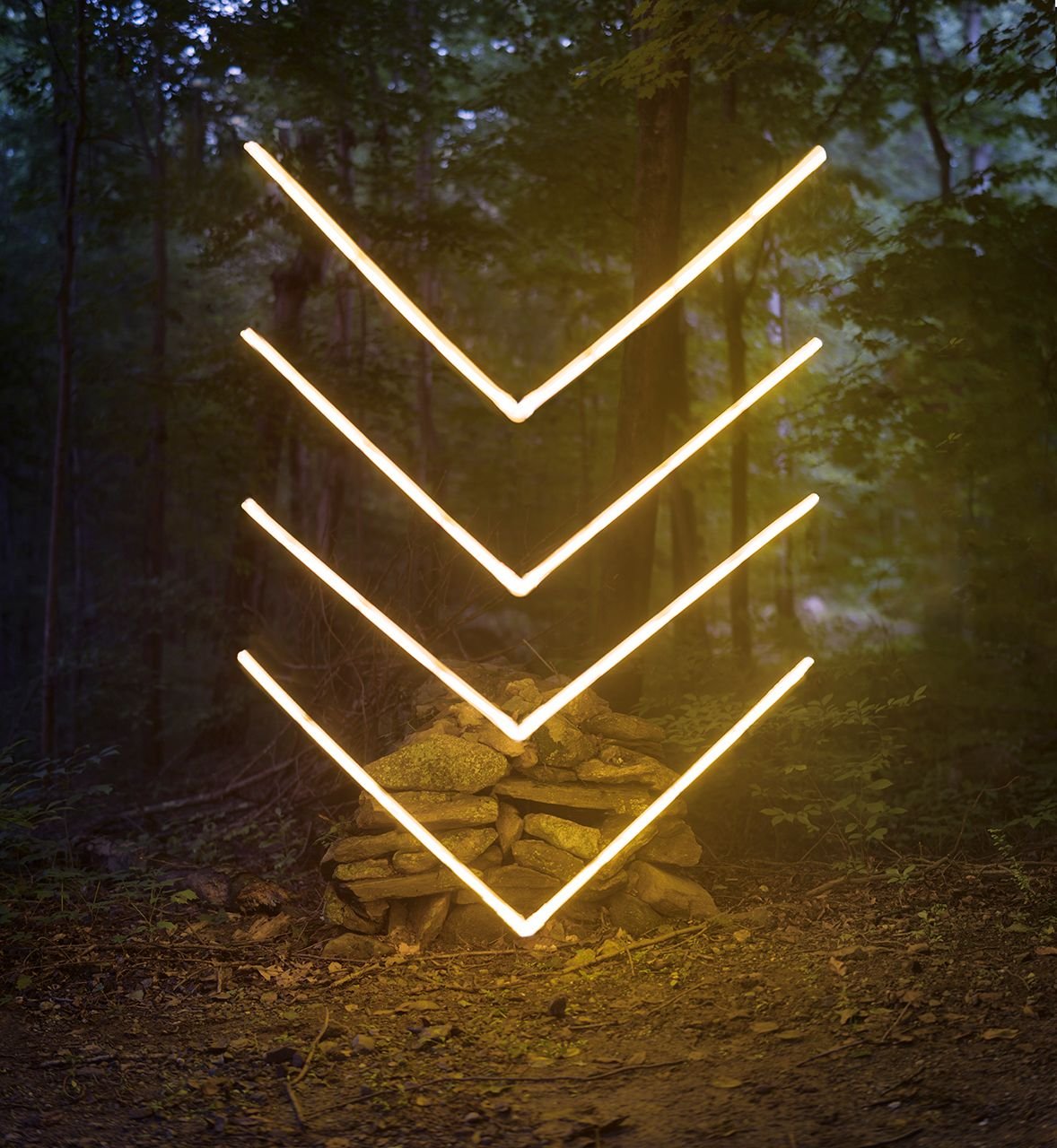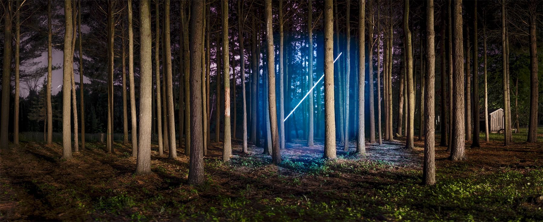 My work titled is a series of long-exposure photographic images of sculptural structures I build on-site in specific landscapes. I construct these tableaux by immersing myself in a given place, researching and instinctively reading the terrain, and then marking the site using foreign materials (LED lights, luminescent substances, and other physical processes) to emphasize and call attention to environmental blight. In the final prints, lights and sculptural alterations appear as intrusions.