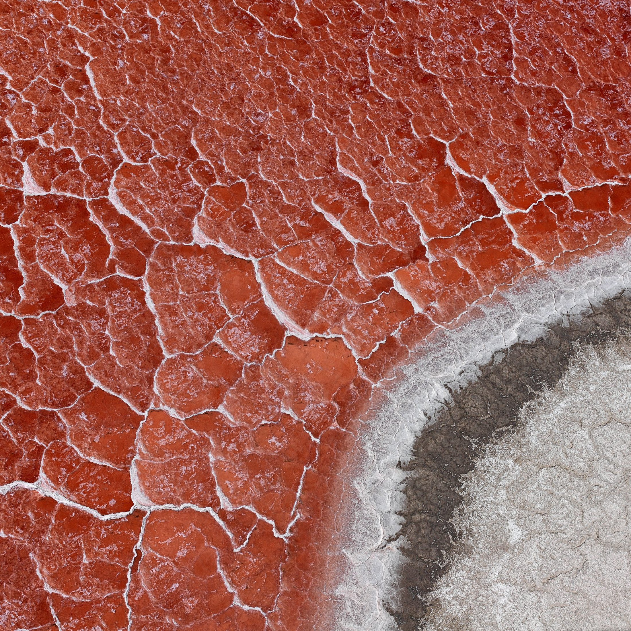 ORANGE-RED. Searles Lake, USA. Masses of red, salt-loving algae live in the swamps on the banks of Lake Searles, a salt lake in the Mojave desert. The lake is named after John Searles who ran the first salt mine there in 1873. Even today borax is still mined on the shores of this salt lake. © Bernhard Edmaier