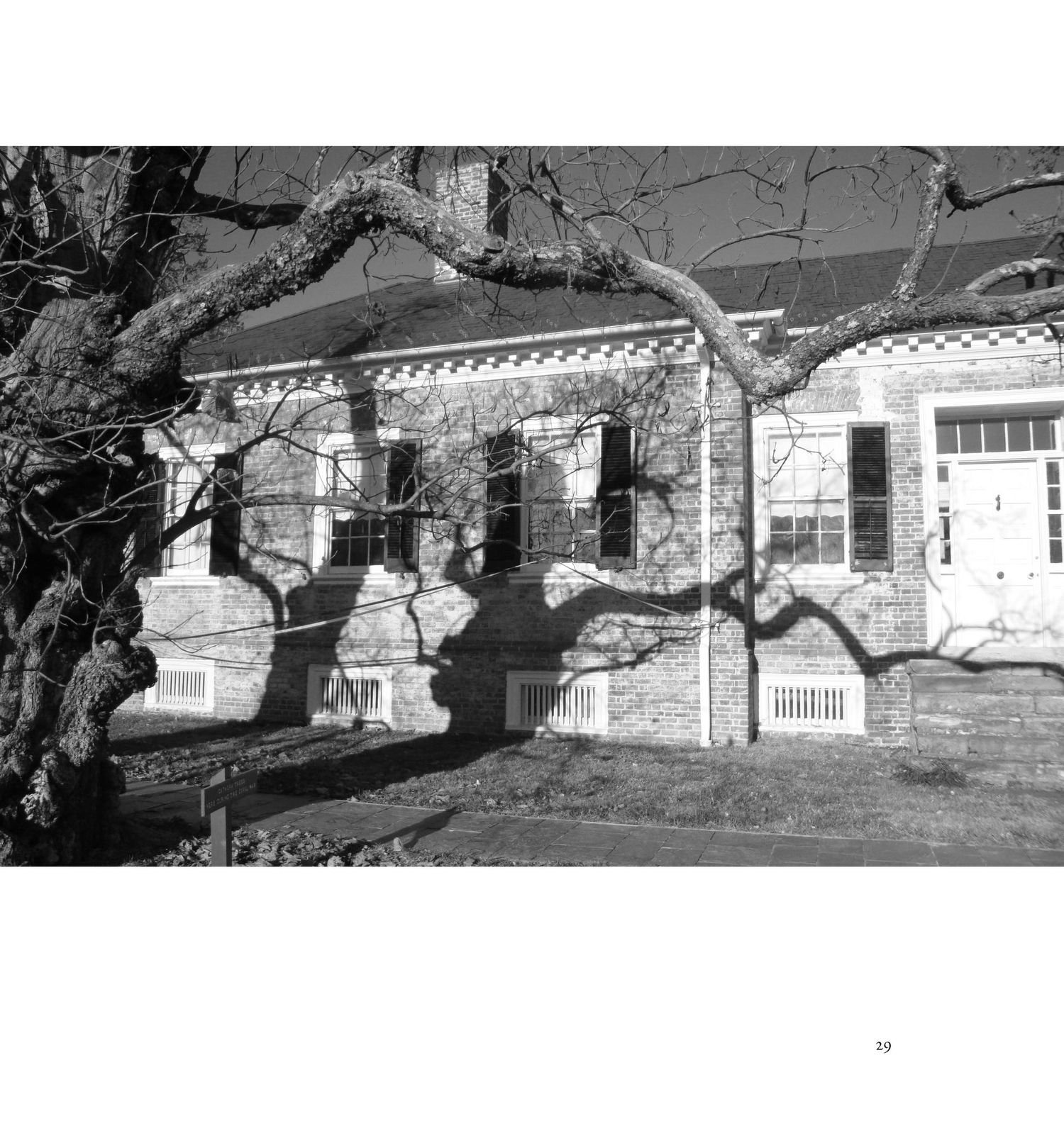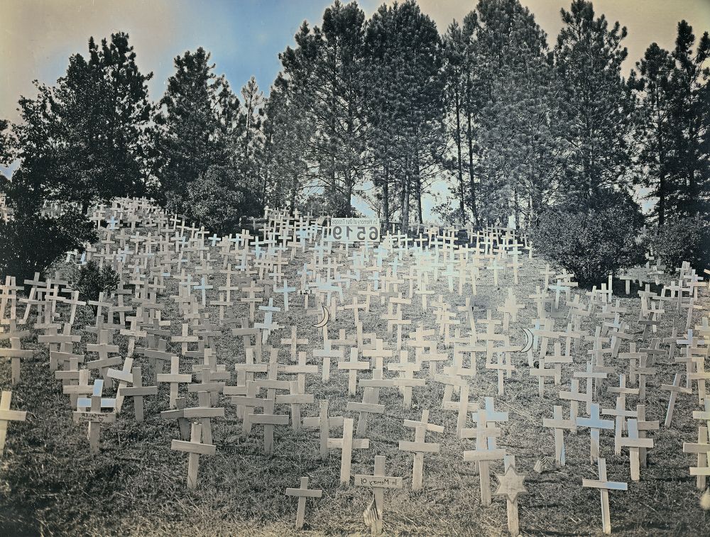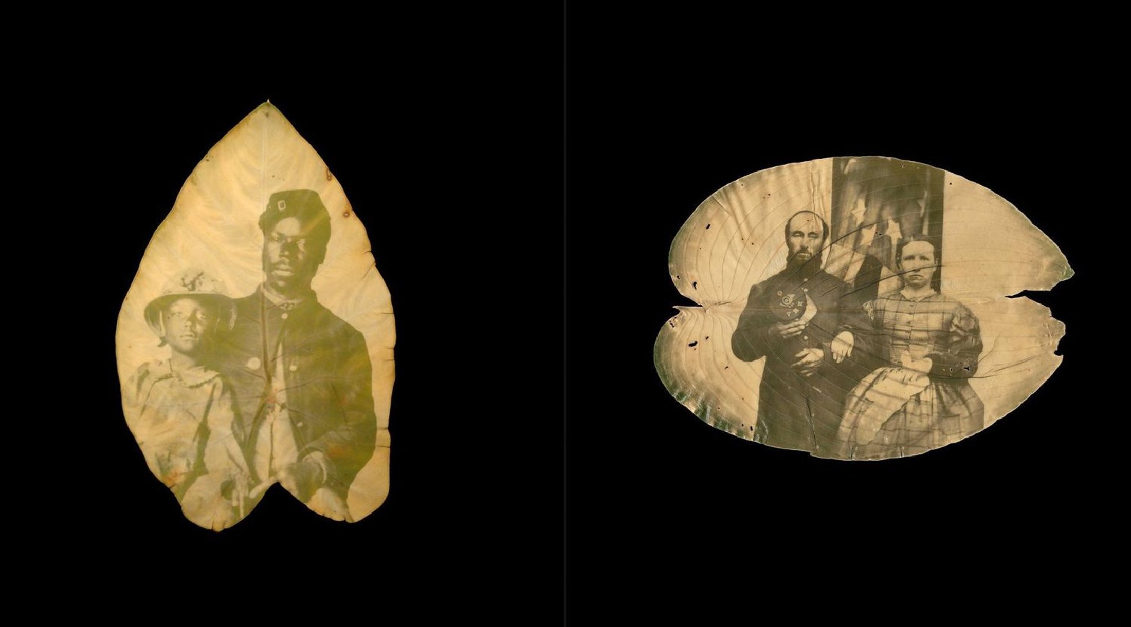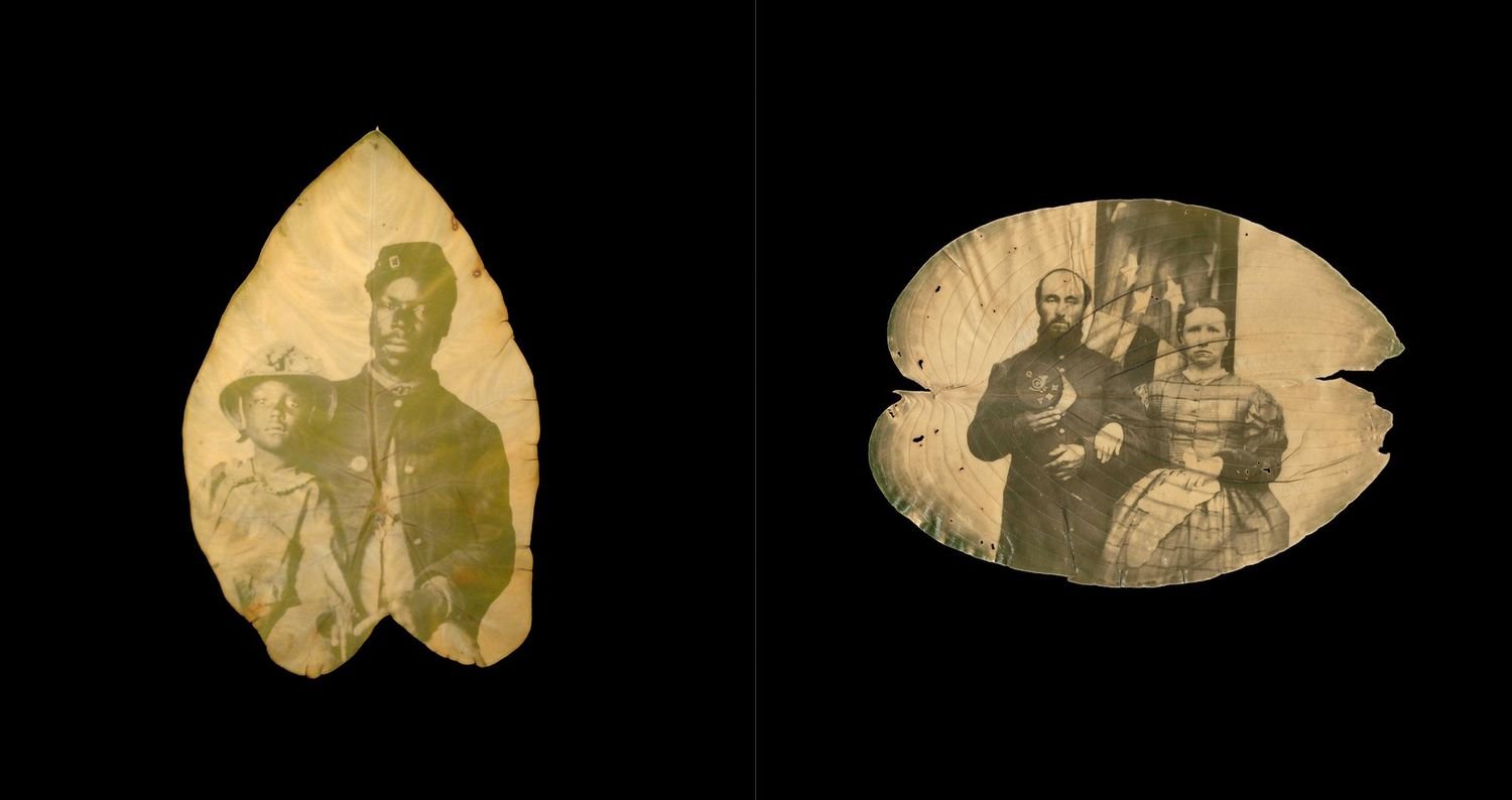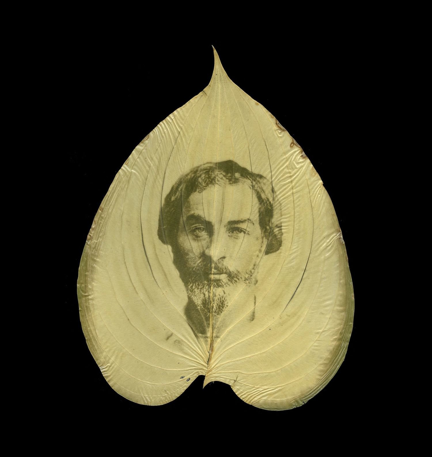The Chlorophyll prints are especially poignant. Schultz explains the process, which he learned from Danh, by saying: “Lately I have traveled there with some regularity to browse the grounds, to look from the high situation of the house across the Rappahannock to the spires of old Fredericksburg, to photograph the catalpas, and, with permission, to pluck a leaf from the trees that have grown from ground soaked by what Whitman called the “butcher’s shambles” of war. I carry the leaf to my car, where I lay it on a felt-covered board, then cover it with a plastic transparency and a sheet of glass. The transparency is printed with a soldier’s portrait…and when I clip these layers together I place the board in the back window of my car where the sun pours down. As I drive home to Roanoke, some three and a half hours away, the leaf will begin to change. Where the transparency is clear the leaf will bleach, and the soldier’s image will appear, embodied in the leaf’s sheltered pigments.”