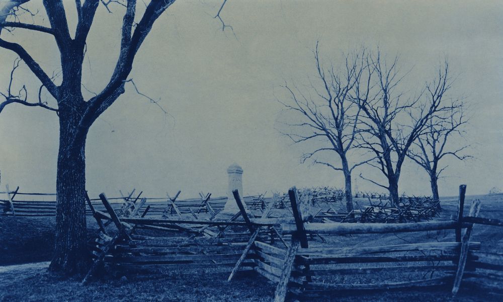 Let’s begin with the parts. The book contains fragments from a great many Walt Whitman poems. Whitman, of course, was alive and working during the Civil War. The book contains Civil War era portraits from the Liljenquist Family Collection of ambrotypes and tintypes. The book contains essays—by Robert Schultz (award winning poet and fiction writer), Molly Rogers (who writes about the history and theory of photography), Barbara Bair (historian at the US Library of Congress), David Lehman (poet, critic, and founder of the Best American Poetry annual), and Stanley Plumley (award winning poet, author of more than eleven books)—each of them elegant and insightful. The book contains contemporary cyanotypes of Civil War sites by Binh Danh (professor of photography at San Jose State University). And the book contains Chlorophyll prints as well as poetry by Schultz.