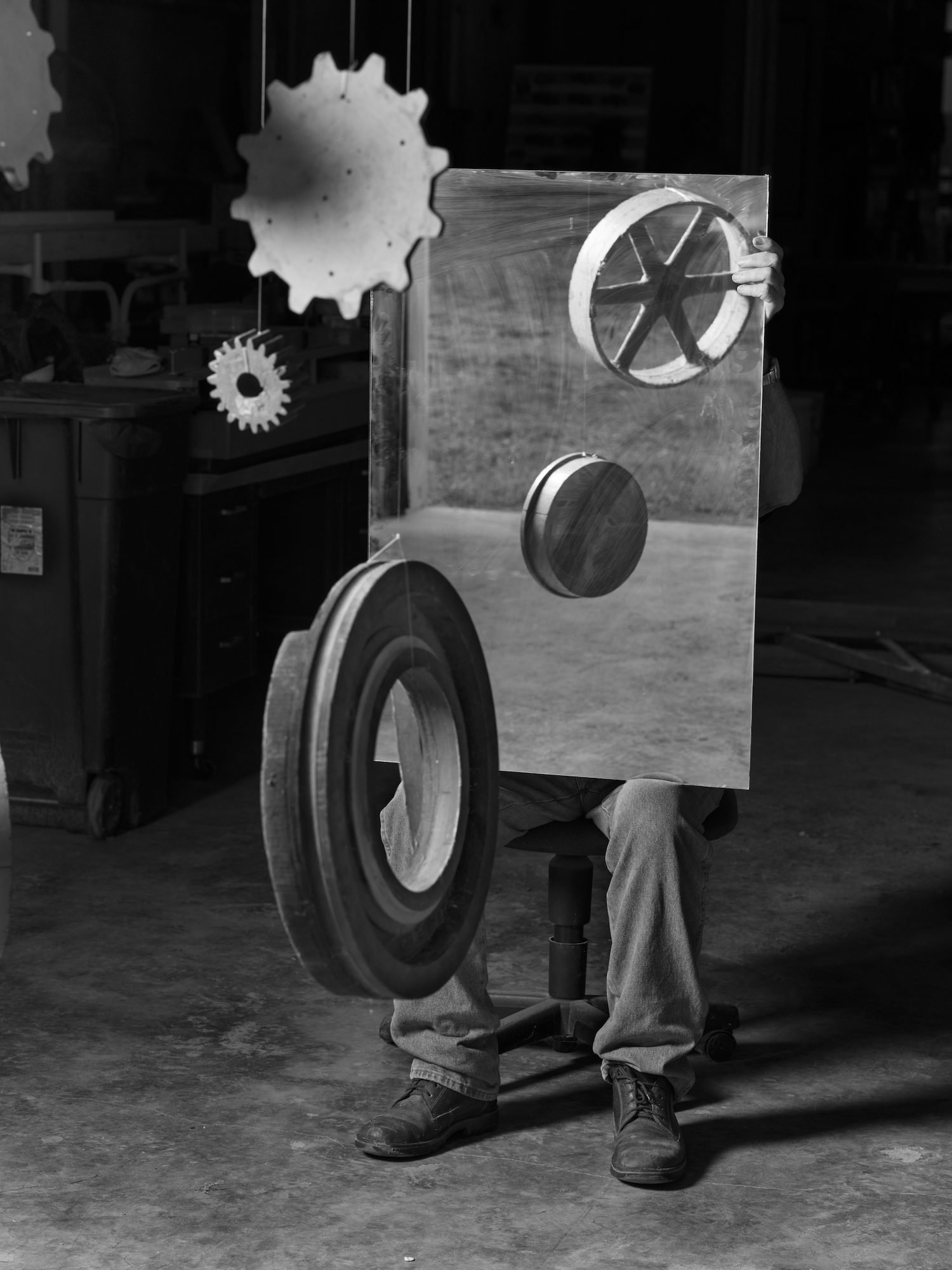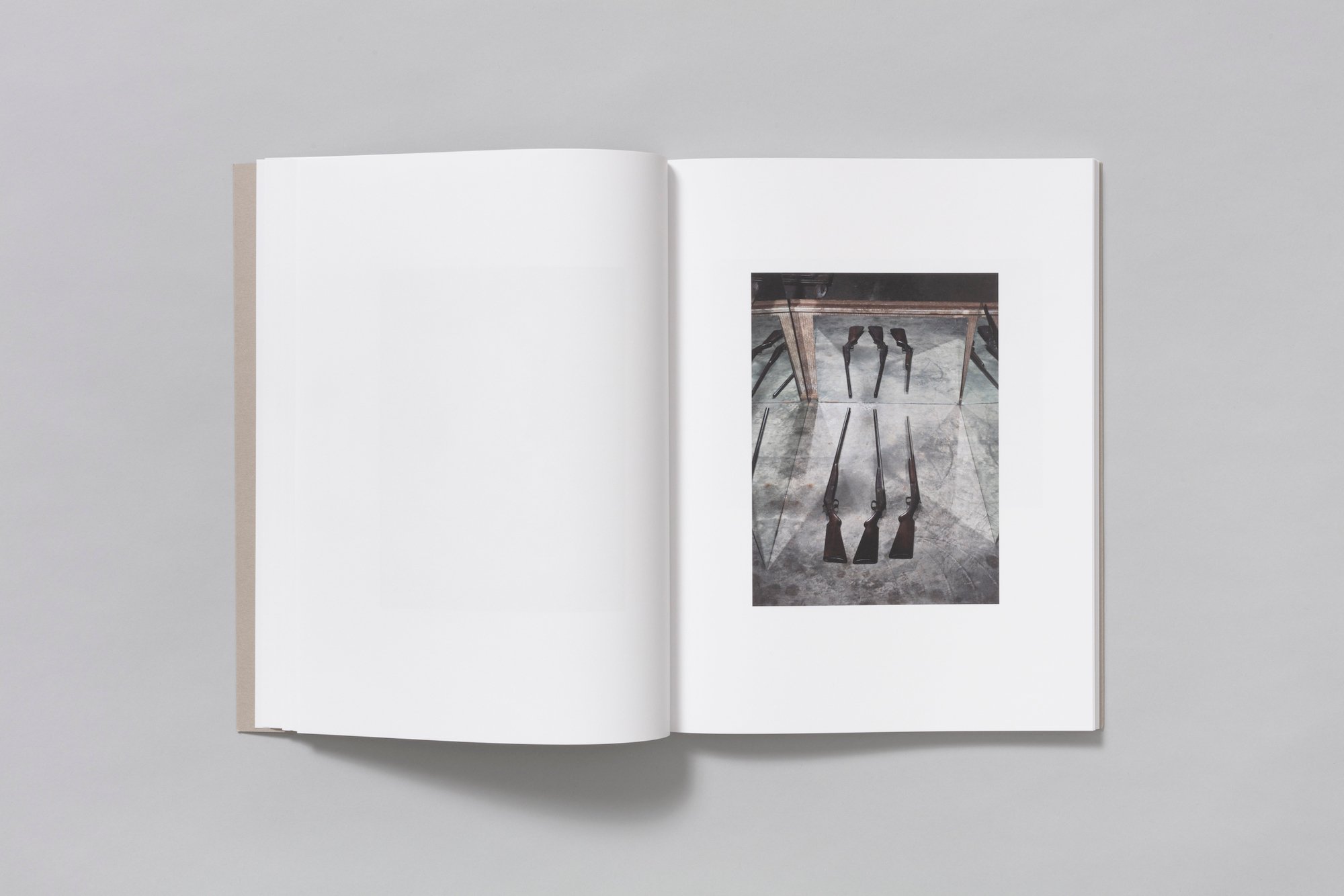 Lovingly detailed images of male flesh punctuate the book, reminders of fragility. One of Drake’s favorite images is a closeup of a man’s clavicle and neck. “It sets the stage that there’s some love and empathy in the book,” she says. Mirrors reflect at us, offering surreal invitations to our own participation. The centerfold is a literal inversion—a man hanging upside down in his garage papered with Playboy magazines. It’s as if the secrets to power could fall from his pockets in a shower of loose change.