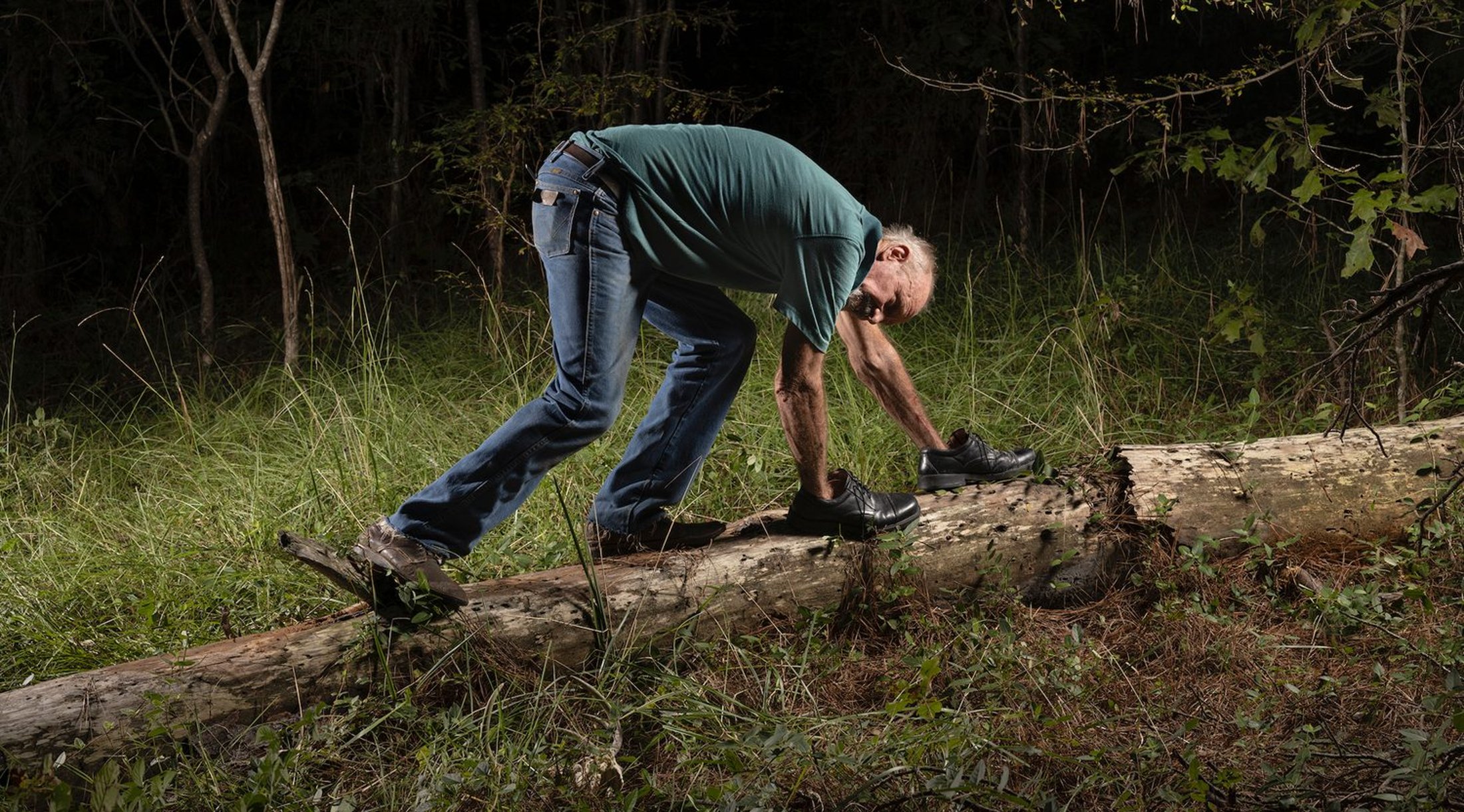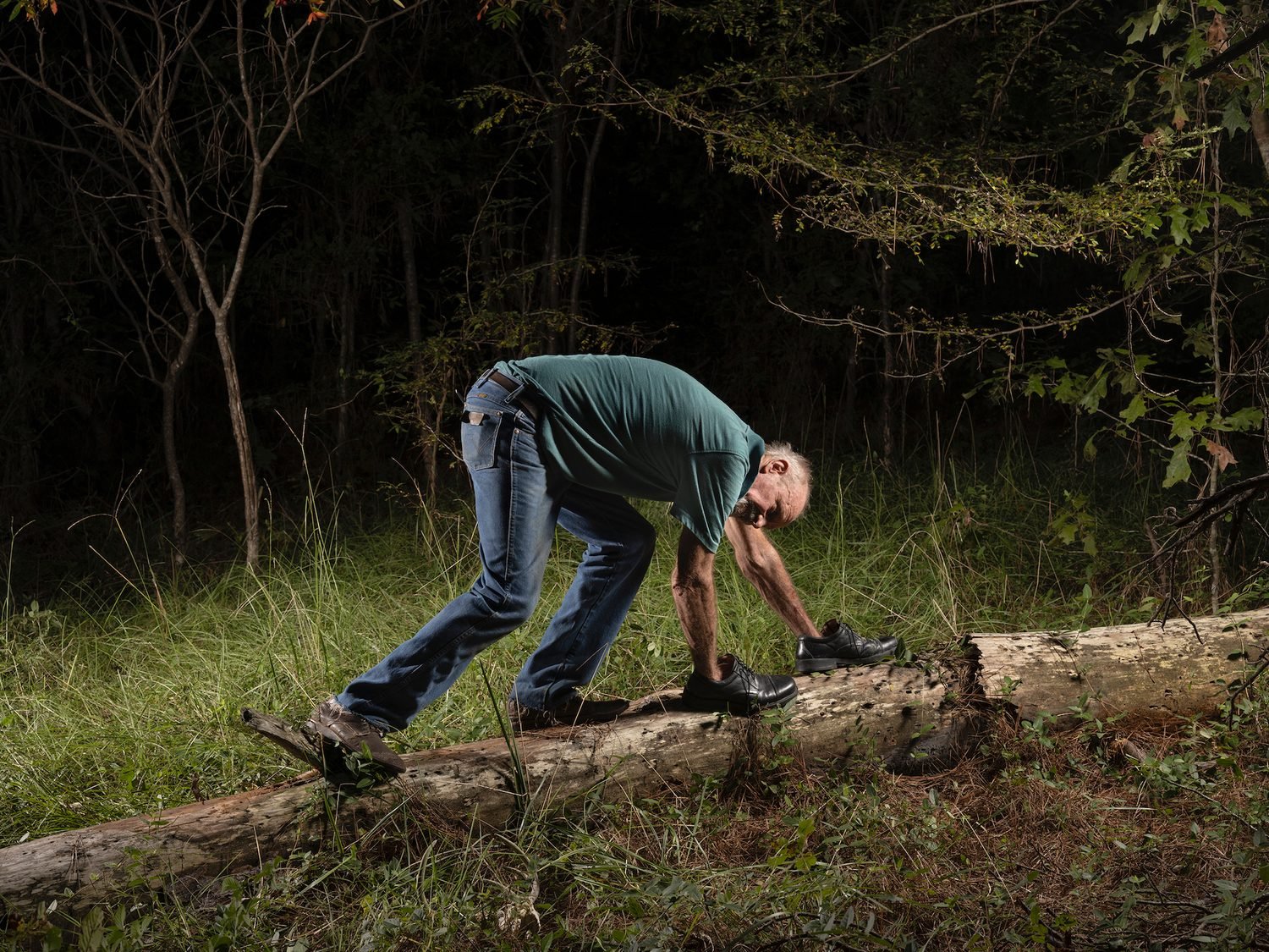 Drake is in charge—but the men she photographs are mostly willing participants, eager, even: hanging from their feet, or somersaulting, ass in the air, or crawling on logs with shoes on their hands. Others present only their most tender parts. “I really wanted to expose the body and demean it and play with the idea of seeing how far I could push men, even if they didn’t want to,” she says.