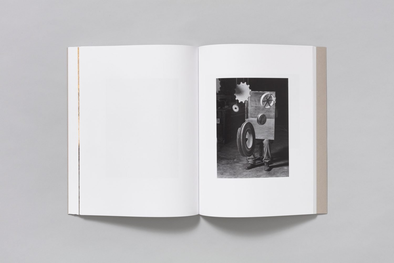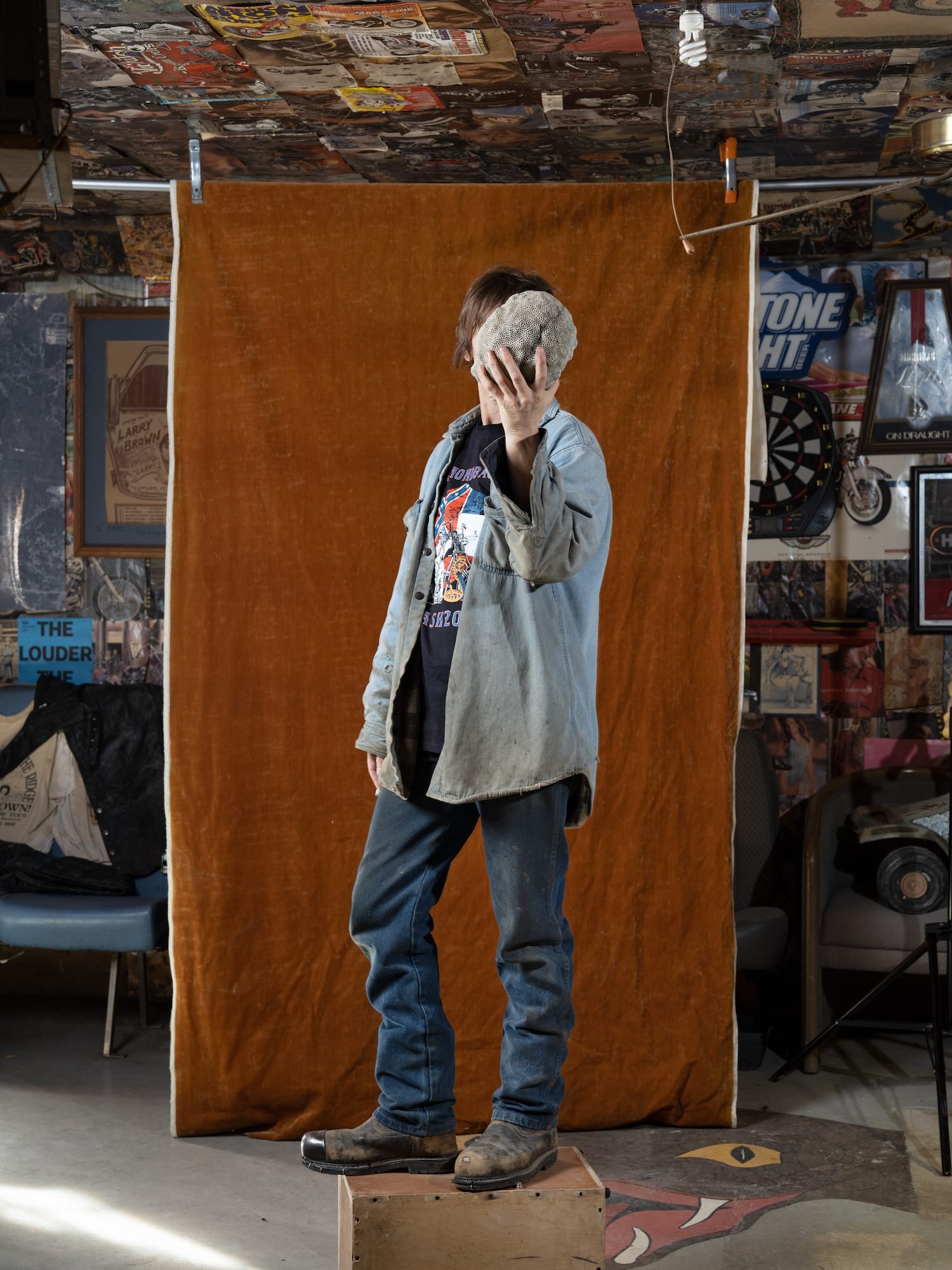 Luxurious and difficult at the same time, Carolyn Drake’s latest book photobook, Men Untitled is an exorcism of male power. One of the first photographs in the book is an arresting image of Drake in men’s clothing. This is drag that performs a blue-collar man, but also the male artist and his model on a platform, who holds forth an object for examination. The object appears to be the lumpy backside of a plaster mold. Is this the unformed mud of man before the garden? The round shape hides the face of the artist. But her eyes, and her ideas burn into the back of it, filling the cup of the face and offering it to us.