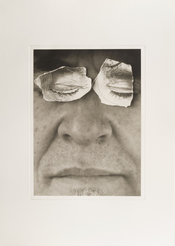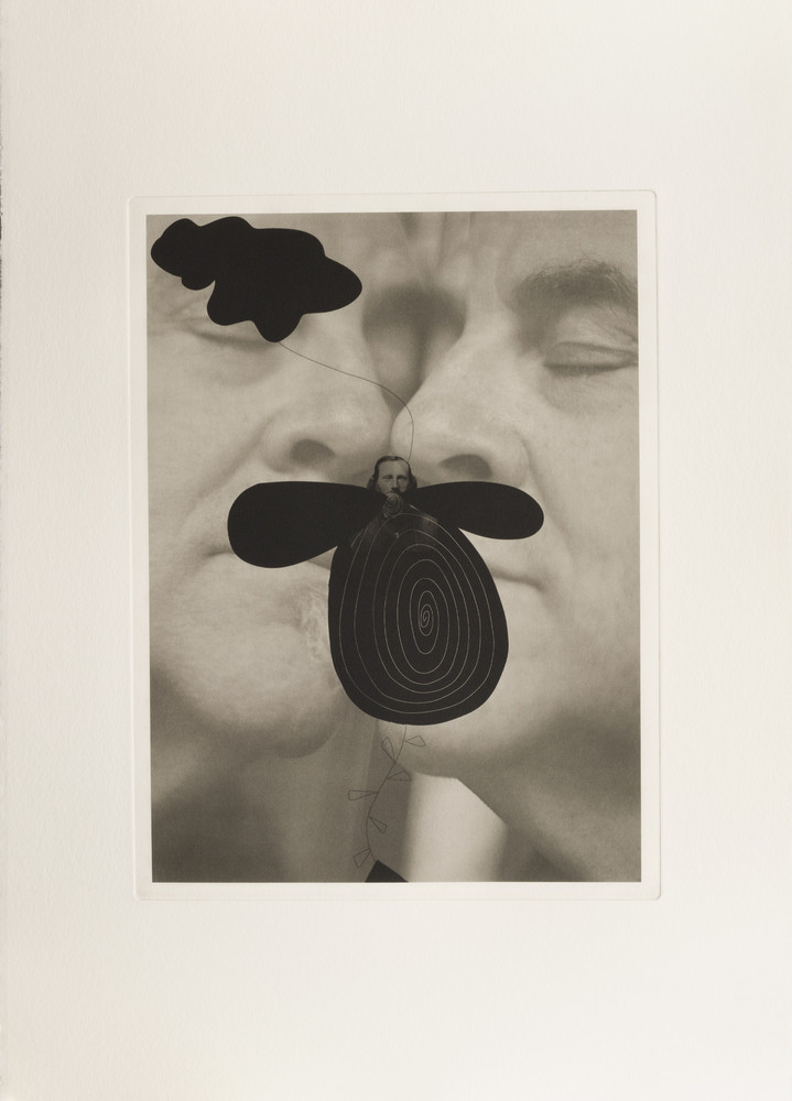 “I began by making portraits with my camera. The gravure plates are covered with a protective sheet similar in color to vellum. Immediately this covering became the material that guided my process,” Cone explains. “I began cutting the vellum and photographing through it. I re-photographed some of the gravures that were collaged with source material I found at a local antique shop. I also used clay paint on some of the printed plates before exposing them.”