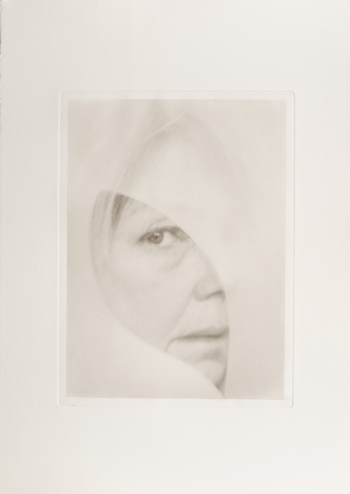 Eyes follow you from behind a slit in a translucent sheet. A tear, loosely sewn, cuts across an image. A nose emerges, and elsewhere faces float in repose, softened and semi-hidden. Overlays, cuts, and stitches in the smoky surface create a game of hide and seek. Perhaps we’ve caught someone mid-dream, but who? The person in the portrait or the artist herself?