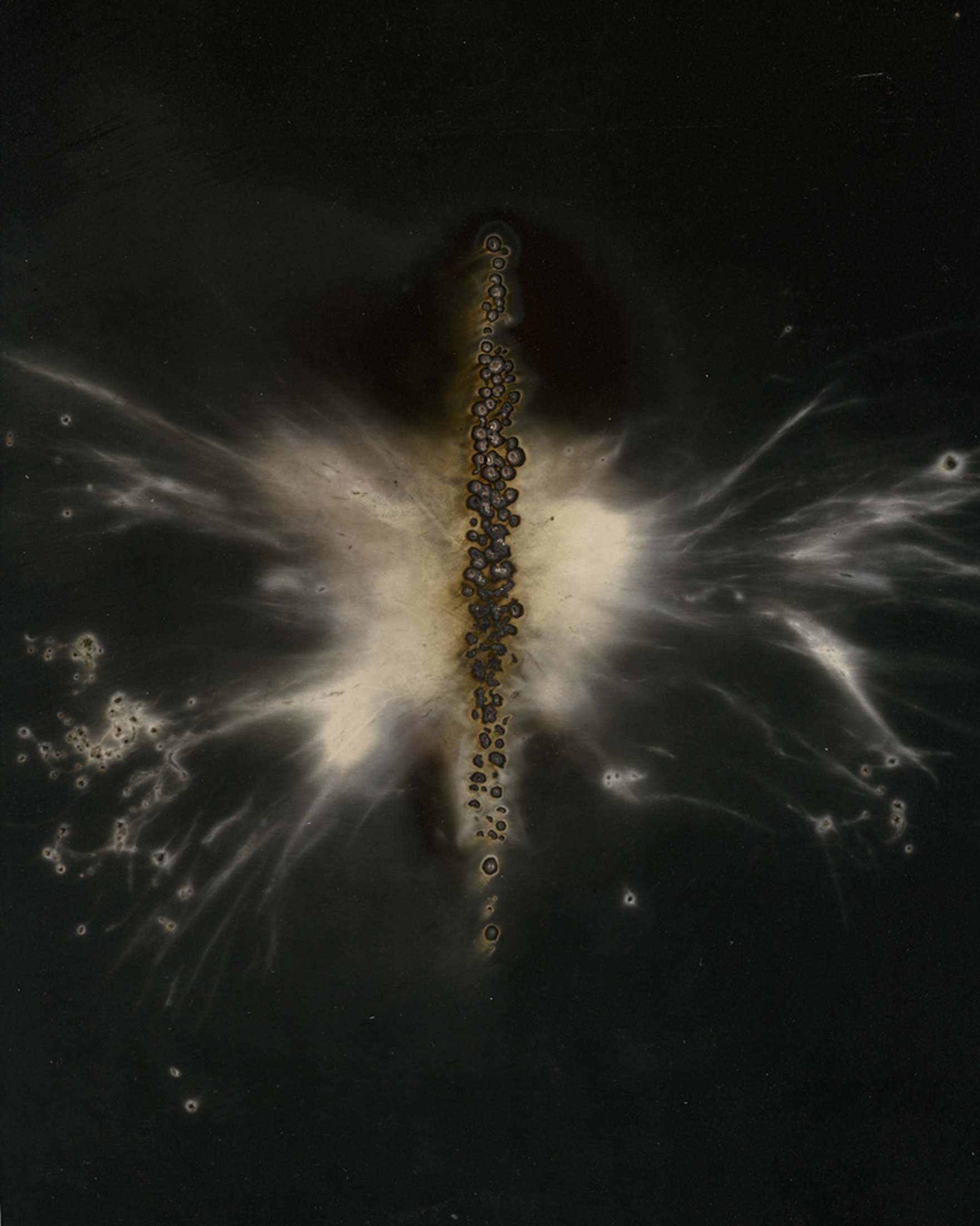 The fire prints were born out of a fascination with the dual nature of creation and destruction that generates this rare light. Each image in this series is made by igniting a small portion of gunpowder on the surface of silver gelatin paper. In the resulting explosion, light and energy abrade and burn the surface while simultaneously exposing the light-sensitive silver emulsion. I loosely control the explosion by placing objects on the paper’s surface, but the results are often surprising and unpredictable, as the explosive energy of gunpowder is the true generative force creating the image. These fire prints visually reference celestial events, the residue of both creation and obliteration, generated from a single spark.
