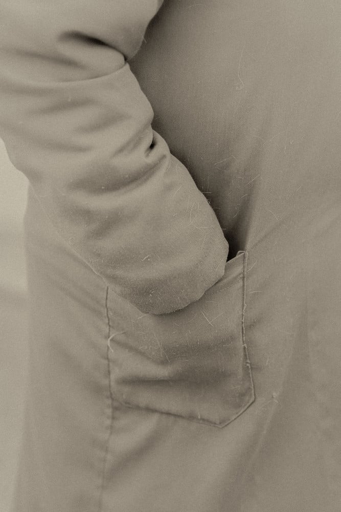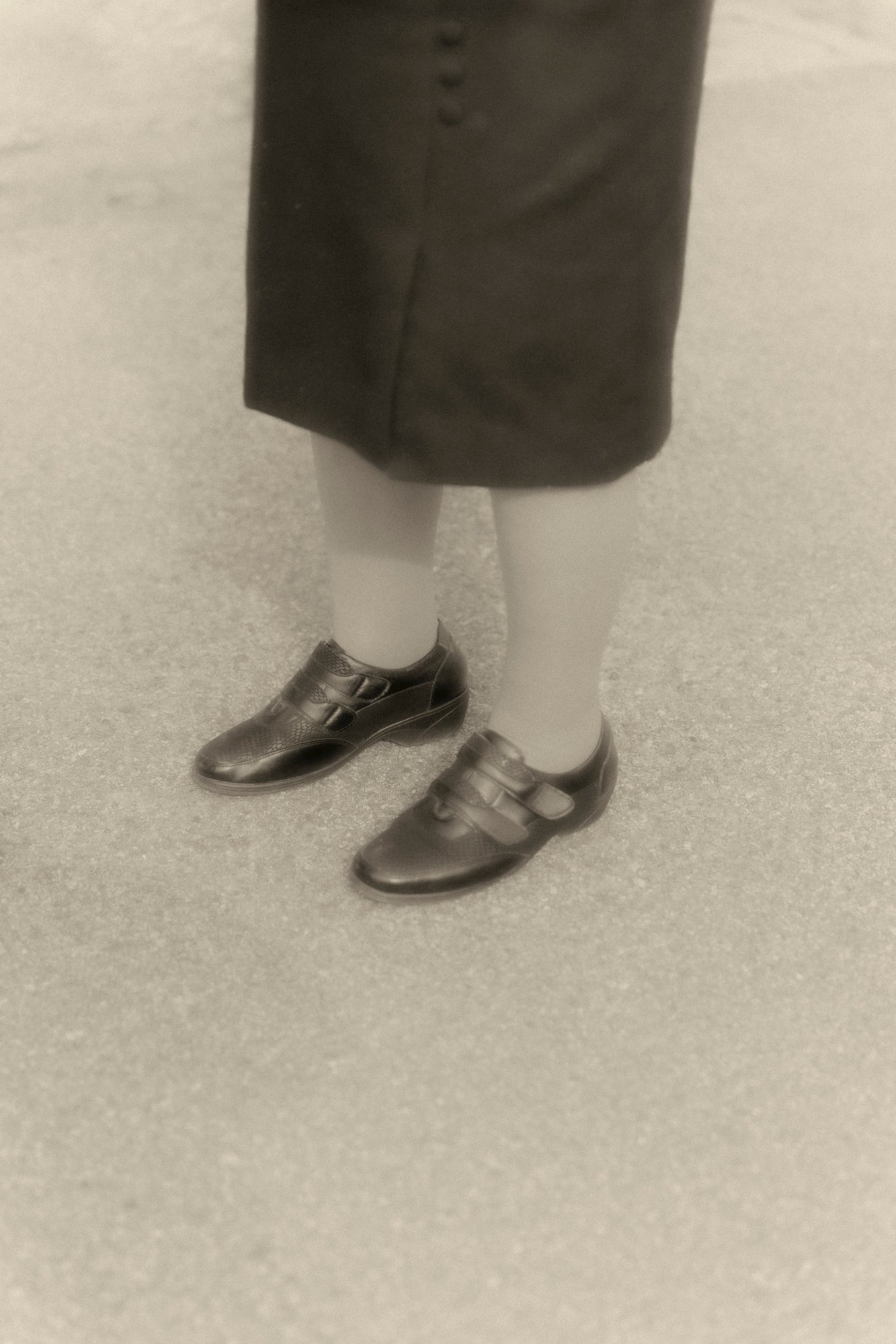 Reverence is, in fact, another subject of Finalmente posso andare. We see it in Fiorella, an image of the skirt, stockinged legs, and shoes of what appears to be an elderly woman. In The hand, a photograph of a man’s arm and torso in an overcoat, his hand hidden in the pocket. From the fur on the fabric, it seems that he has just been in close contact with an animal. And we see it in Lucia, an image made from an elevated vantage point of the back of a young woman’s head, her hair elegantly knotted and graced by light. A friend of the photographer’s, the subject is seen outdoors in a sweater, with trees and perhaps garden tools in the background.