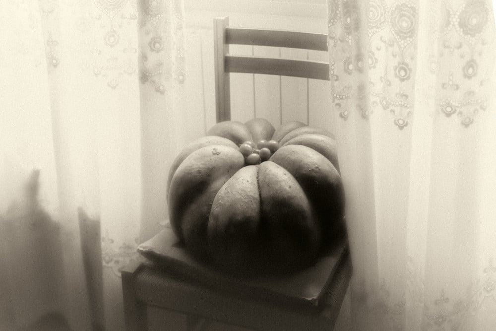 Even a squash holds this divine presence. The pumpkin is an image of a vegetable on a chair in front of a curtained window. The lines and shapes in the fabric reference those of the vegetable. The circular patterns on the curtains echo the small tomatoes that rest on top of the squash. There is as much reverence in this image as there is in any other image in the body of work.