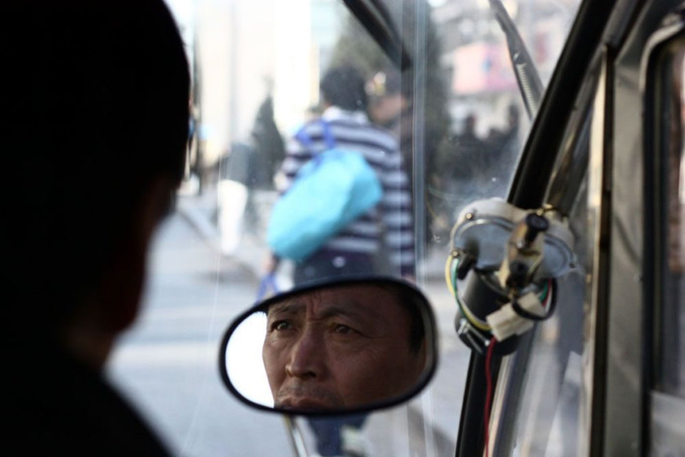This series of photos was taken in Beijing over the course of one year in 2009 during my daily morning rides to work. On those mornings, I let myself slip into reverie. Enclosed in a narrow vehicle, I acted as a quiet observer. My visual curiosity turned the taxi into a portable laboratory where I got to examine and dissect the ever-changing environment which surrounded me. I saw people, they saw me, but we never met. I silently observed the chaotic ballet of cars, bikes and people. Between voyeurism and contemplation, my focus on insignificant objects and anonymous people seemed to amplify their significance.