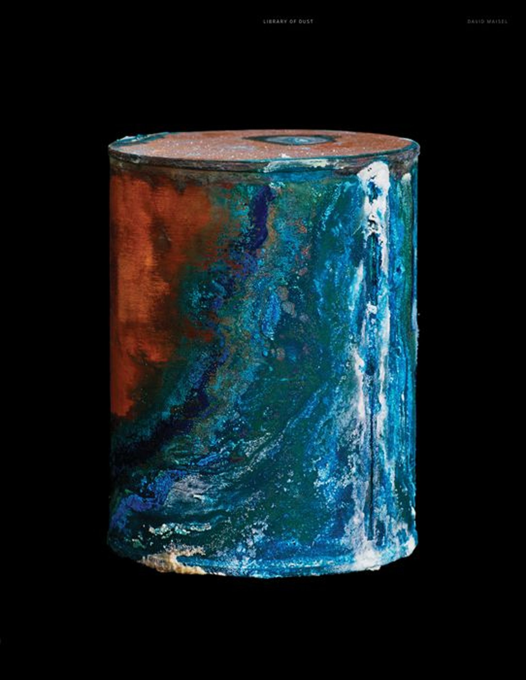 Maisel discovered these colorful abstractions in a state-run psychiatric hospital in Oregon, where the patients who had died there — and whose bodies were not claimed by any family member — were cremated. Their ashes were sealed in handmade copper canisters and stored on shelves in a giant library-type room that contained several thousand nearly identical cans. Each “spirit” that is housed in these cans seems to demand its unique individuality, even after death and cremation. Maisel was struck by the unexpected beauty he discovered there, where, in his words, “Corrosion blooms wildly from the leaden seams of many of the cans.”