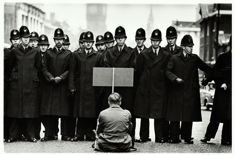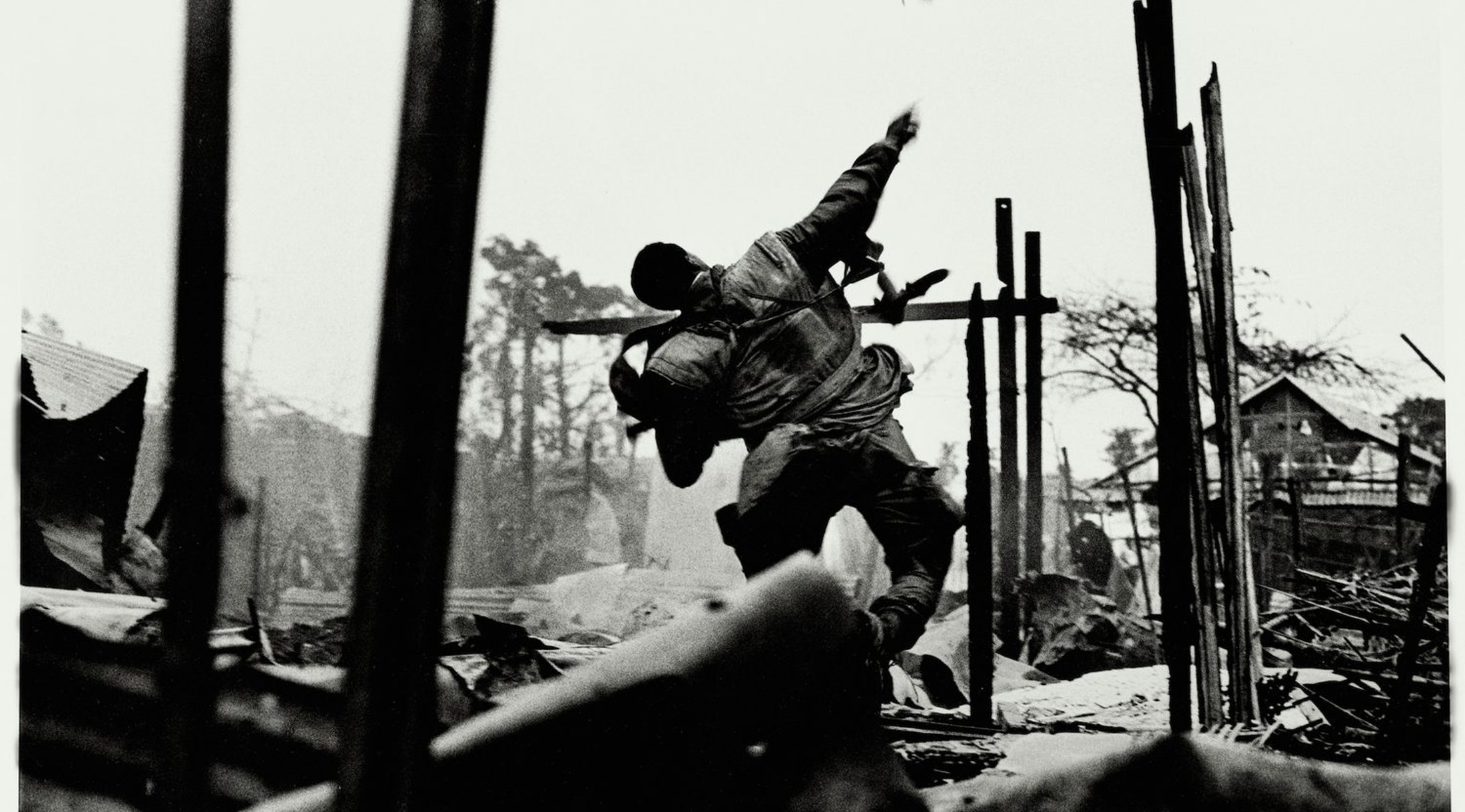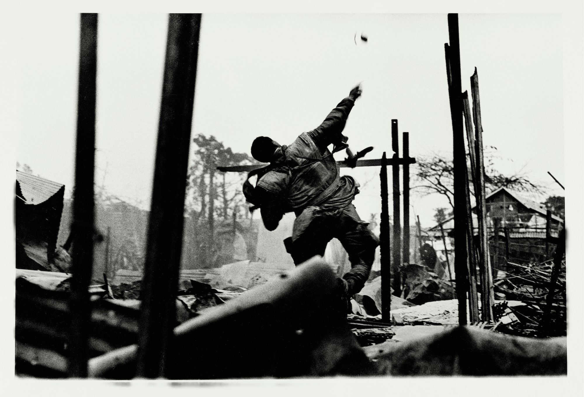 With McCullin’s pictures, content understandably dominates. This means we do not always address their extraordinary formal brilliance. His pictures bring the grace and beauty associated with Henri Cartier-Bresson’s ‘decisive moment’ into war zones. There is a lyrical aspect to many as he responds to the expressive power and force of gestures of suffering and grief. On occasion he also registers jubilation—for example, the portrait of the young stone thrower in Derry, caught mid-air as he jumps with joy, hands uplifted and face beaming, as he addresses his triumph to a youth standing before him. It is distinct from earlier pictures of protests on the streets in the UK, where protestors use their bodies as resistance as they are pictured blocking the street or being dragged by the police.