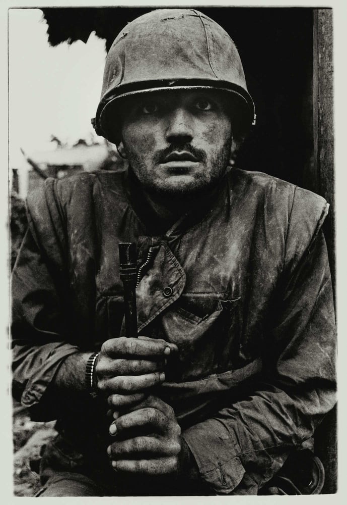 Much as he hated the looting soldiers, he was as he said, “part of them. I was sharing their food, their uniform, their daily lives.” But their enemy was not his enemy. While he pictured stricken and injured American marines, he also showed them tormenting a blindfolded old Vietnamese civilian. The inclusion of a tender portrait of an elderly Vietnamese male among his photographs of the war in Vietnam is also very telling.