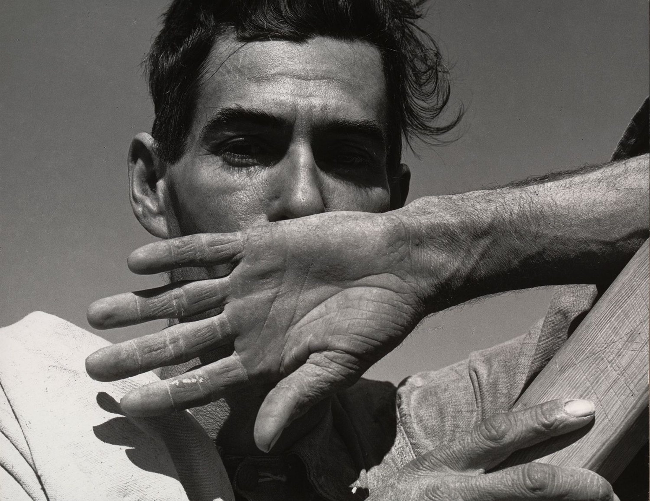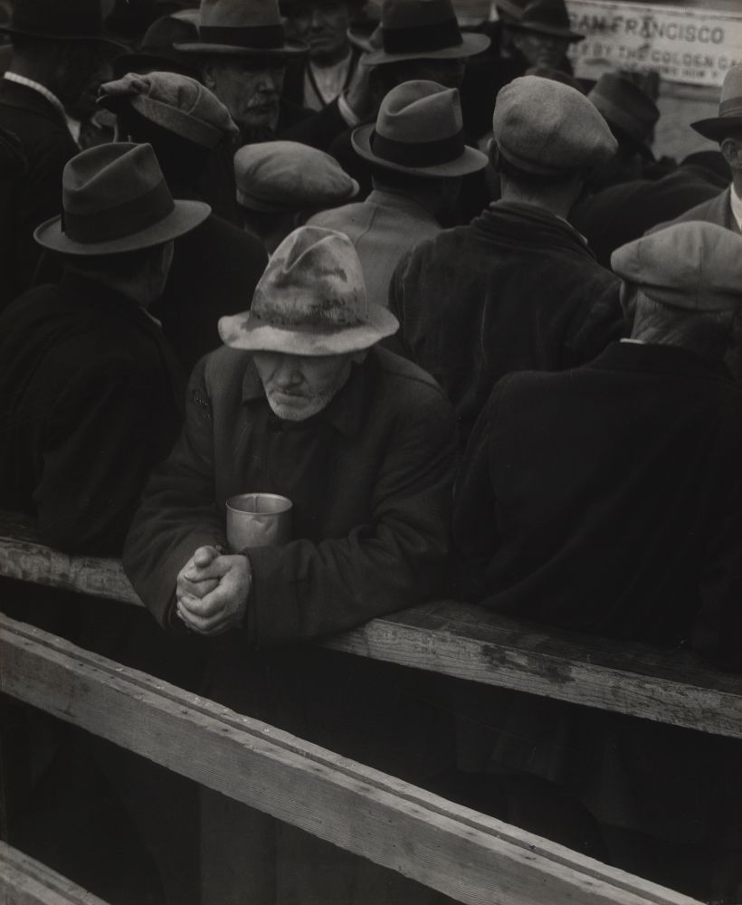 As I write this from my home in New York City, the lines at food banks are blocks long. With a deep measure of grief, it is an apt time to revisit these photographs. In the photograph White Angel Bread Line, San Francisco (1933), a man is turned toward the camera, away from the mass of people waiting. His eyes are hidden by the brim of his hat, a look of resignation about him, hands clasped.