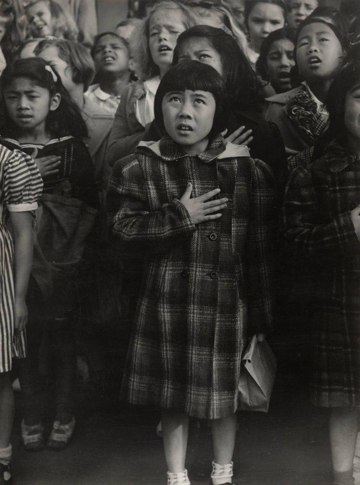 In another photograph, One Nation Indivisible, San Francisco (1942), a group of children appear to be reciting the pledge of allegiance, amongst them a young Japanese-American girl. Her inquisitive look belies what was happening across the country during the Second World War, as people of Japanese descent were forcibly relocated to internment camps. Lange had been working on a series of images documenting these deportations, only to see the photographs pulled from circulation, undermining the full context of what was happening.