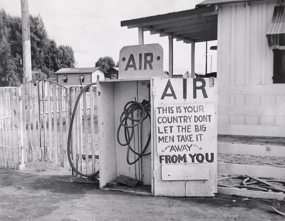 “All photographs can be fortified by words,” Lange wrote. For her, words could extend the power of an image, not just causing an emotional response but also urging the viewer to not only see but to read, to listen carefully. She wrote that her image captions should carry “not only factual information, but also added clues to attitudes, relationships and meanings,” calling these captions “connective tissue.” Some of her image titles exhibit a matter of factness, a dry wit, On the Road to Los Angeles, California (1937) features two men walking down a dirt road towards a billboard advising to take the train next time. An image of men in front of a building is titled Six Tenant Farmers Without Farms, Hardeman County, Texas (1937).