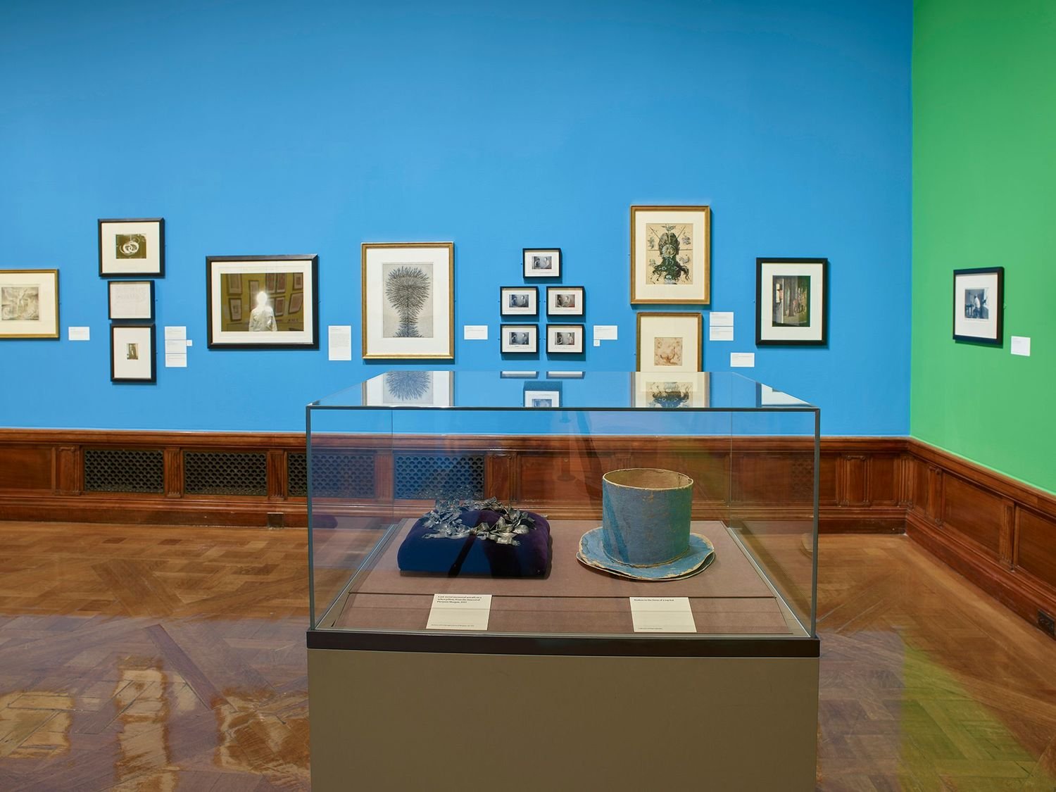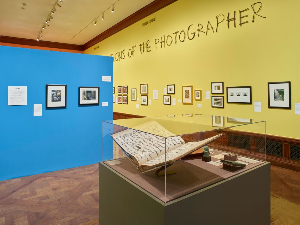 The exhibition design brings the themes of Michals’ work alive; ‘Playtime’ features a fan with a painted cat and a set of paper dolls; ‘Reflection’ greets the visitor with a parabolic, or trick, mirror. This mirror is then paired with the photo work, A Story about A Story, hung next to John F. Collins’ photograph Multiple Self-Portraits from 1937, in which the photographer looks down into an image of himself looking back at the viewer, complicit in the illusion of multiple selves. Hung nearby is a cabinet card from the 1880s, a frame made of flowers around more flowers and the word ‘mirror’. We are left to wonder: was the memorialized man named such? In looking at others looking at themselves, we are looking at vanity but also vulnerability.
