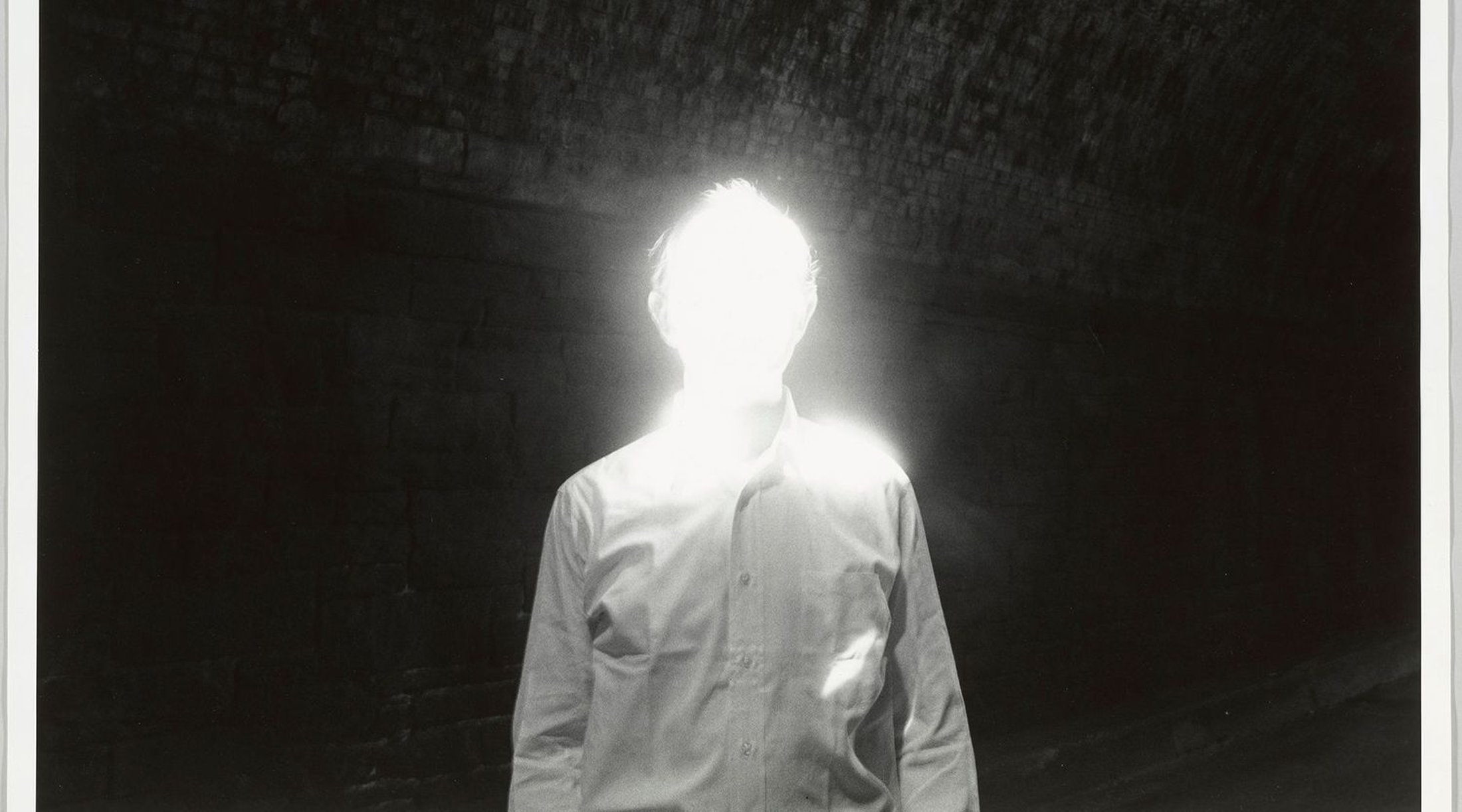 Across the way is ‘Theater’ which includes the work that gives the exhibition its name. The Illusions of the Photographer, made in 1969, is a multi-image work. In a statement Michals explains that these sequential narratives more fully express and explain an event than just one still photograph can and he considers them to be premeditated illustrations. Across nine silver gelatin prints a street scene unfolds, a man reading a paper enters the first photograph, in the second he appears to walk into a box on the ground, as the series continues another man enters the image, he stoops to examine the box and we see the framing of curtains from a theater stage around the print. In the remaining images we are let in on the trick, the camera pulls back to reveal the theater stage set-up as a diorama balanced on a plinth, the scene playing out beyond it. In the final image the photographer is seen kneeling in front of the prop theater as he turns to acknowledge the viewer, sealing the loop of the narrative, as if winking at the grand reveal.
