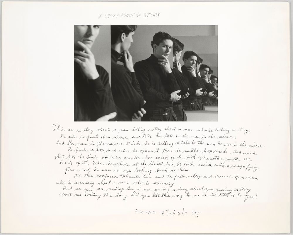 “This is a story about a man telling a story about a man who is telling a story.” So begins the text of Duane Michals’ image A Story About a Story, currently on view in the show Illusions of the Photographer at The Morgan Library & Museum. Illusions of the Photographer is an exhibition about a man who tells stories. I say ‘about’ rather than ‘of’ because the exhibit is both a survey of Michals’ work as well as his interests and inspirations. The exhibition is filled with photographs, paintings, and objects that weave their way through the subjects of Michals’ work; culled from both the Morgan’s impressive collection as well as the artist’s own.