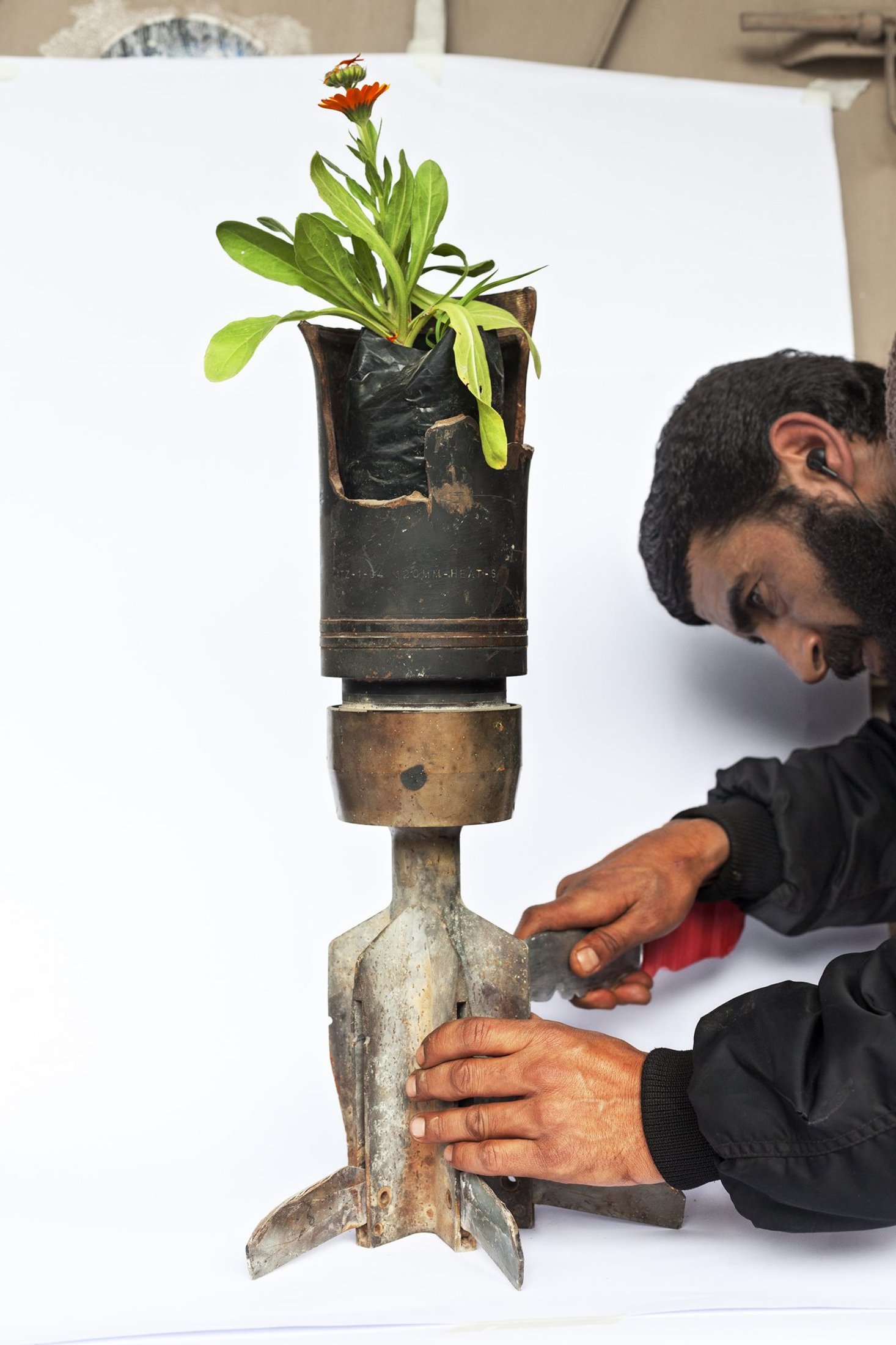 At the same time I started my third project, Gaza, Mode d’Emploi. This series shows what I like so much in Gaza—the sense of humor and the sarcastic way of seeing things. It probably expresses my feelings about the place a bit more strongly. To make the work, I touched nothing and made my photos of the objects exactly where I found them. There was no post-production—I merely placed white backgrounds behind the objects as they lay. After all, I couldn’t have moved the bombs around, even if I had wanted to.