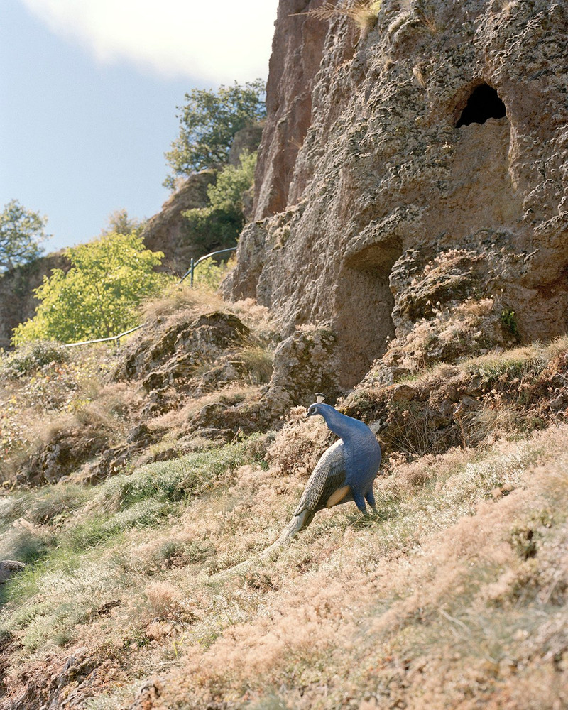 Each of the 11 clues in Valentin’s On The Trail of the Golden Owl consists of a riddle and a painting, and these two components are heavy with symbolism. The paintings of long grasses, cockerels and keys are simple and bold, while the accompanying words speak of phantom images we have to conjure for ourselves: a spiral with four centers, the arrow of Apollo, an opening that reveals a heavenly light. In turn, similar symbols are woven throughout Graham’s photobook—a spiral staircase leading nowhere, for instance, or a single peacock lingering on a hillside.