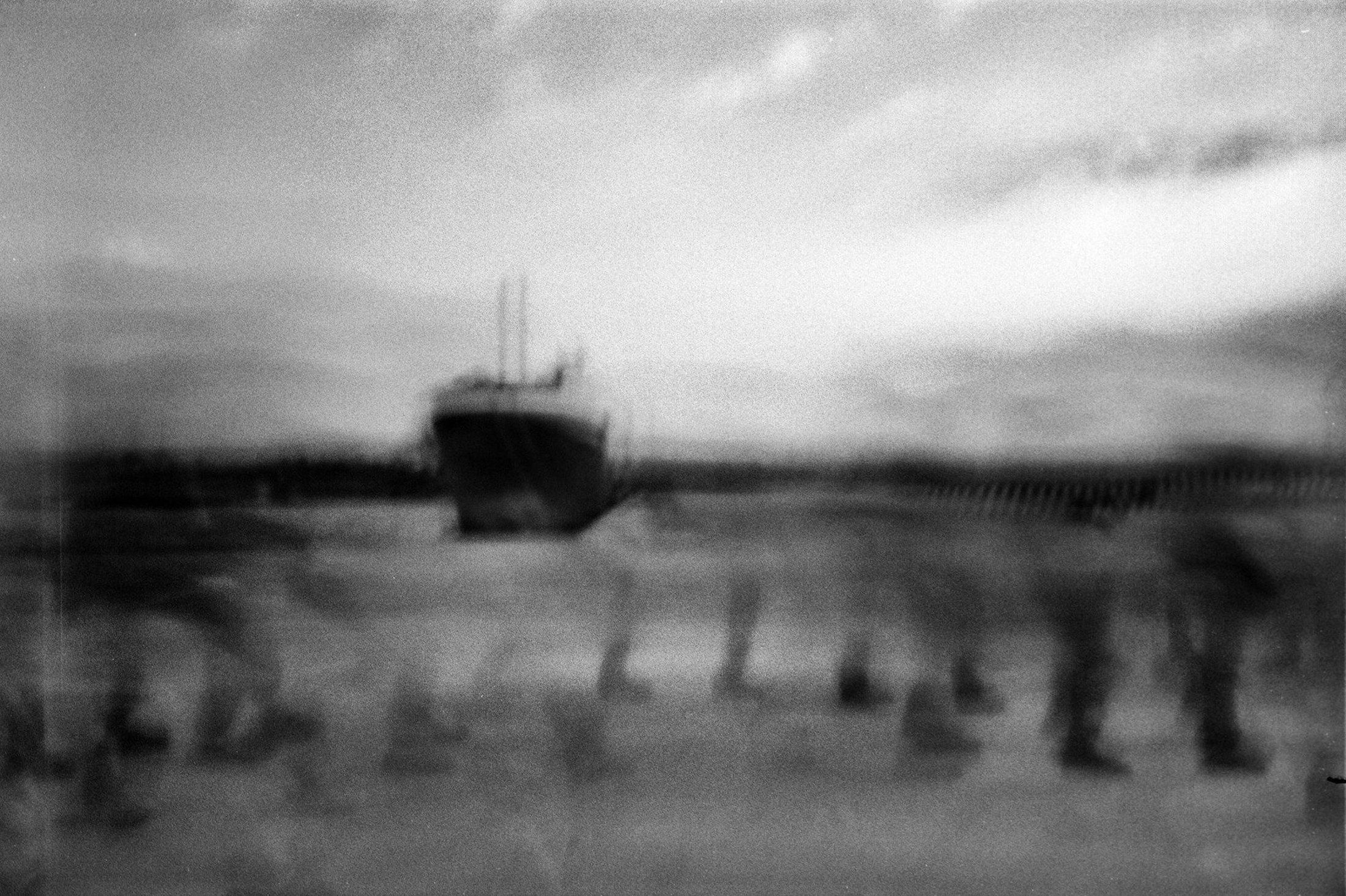 The book itself, as an object, is a masterpiece. Each and every step of the way, we find evidence of abundant thought and care. For example, to produce the pinhole images, Bucciarelli worked with a team to create a unique pinhole camera, built to specification for the project’s particular needs. The cover is inspired by the mottled, mixed-up colors of soaking wet photographs found in the pockets of dead refugees who had washed up on the shores of Italy. In the special edition, the book comes in a life jacket sleeve, hand-sewn by refugees using actual materials from the beaches of Lesvos.