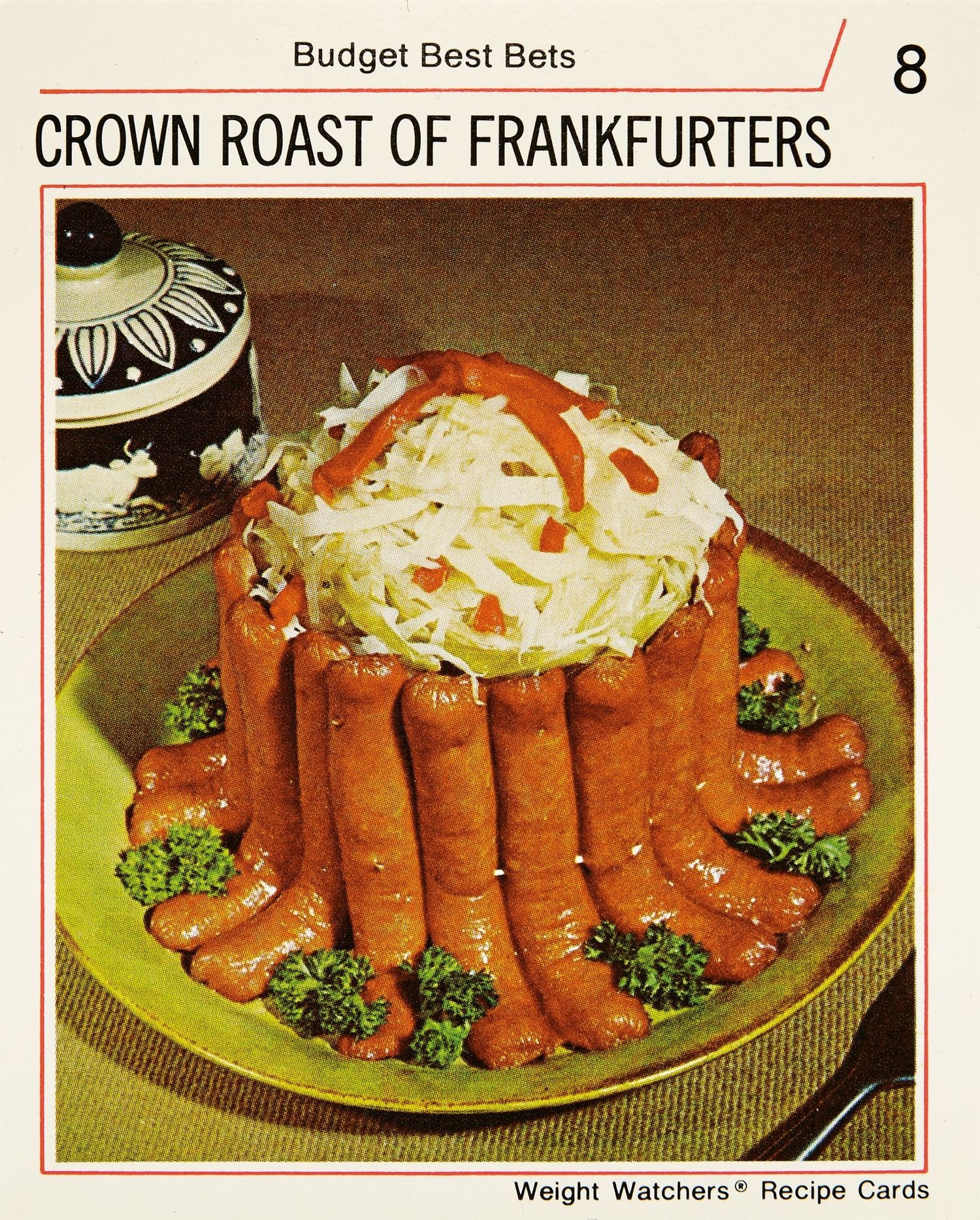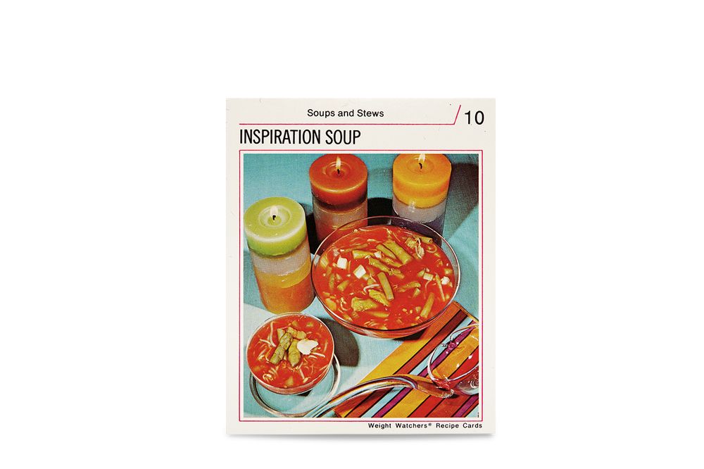 From imaginative editorial and fashion photography to milestone feminist artwork like Martha Rosler’s video-piece Semiotics of the Kitchen, food becomes a stand-in to raise questions about society and challenge values. “You can draw a straight line from the Weight Watchers cards to Cindy Sherman’s out-of-control woman—their shared connection to body image chimes more immediately,” Wolff comments. Seen in combination with the gendered cookbooks of the ’50s and ’60s, and the bizarre and elaborate food stylings of Weight Watcher’s diet recipes, the humor of the work on view, such as Sian Bonnell’s ham-adorned walls and witty take on domesticity, really pops.