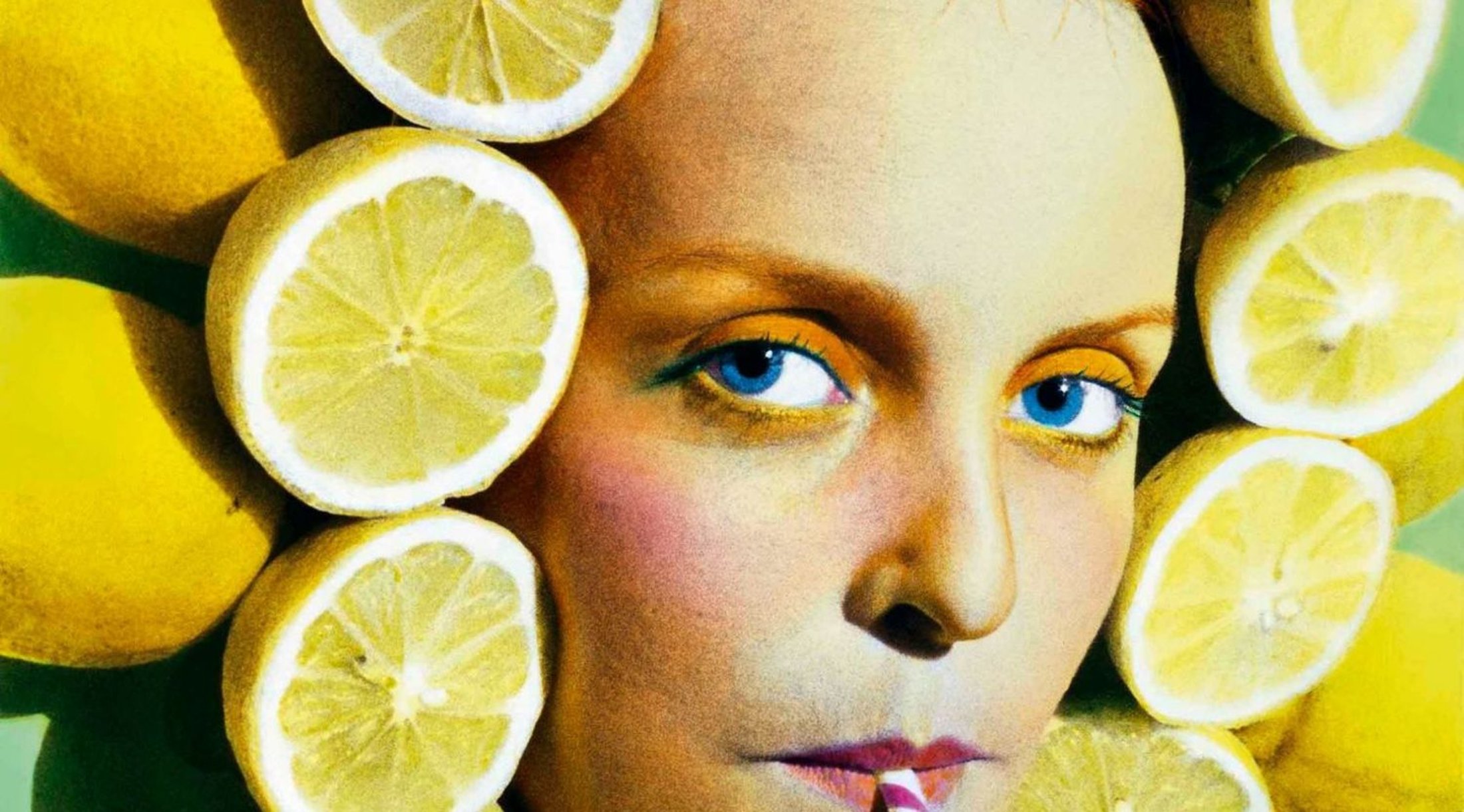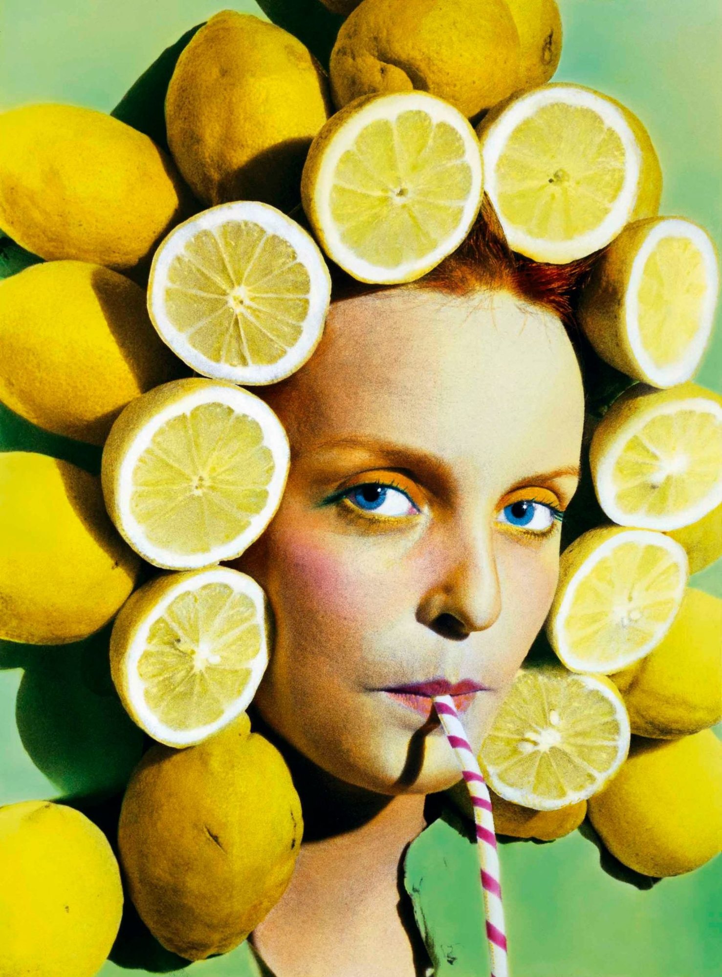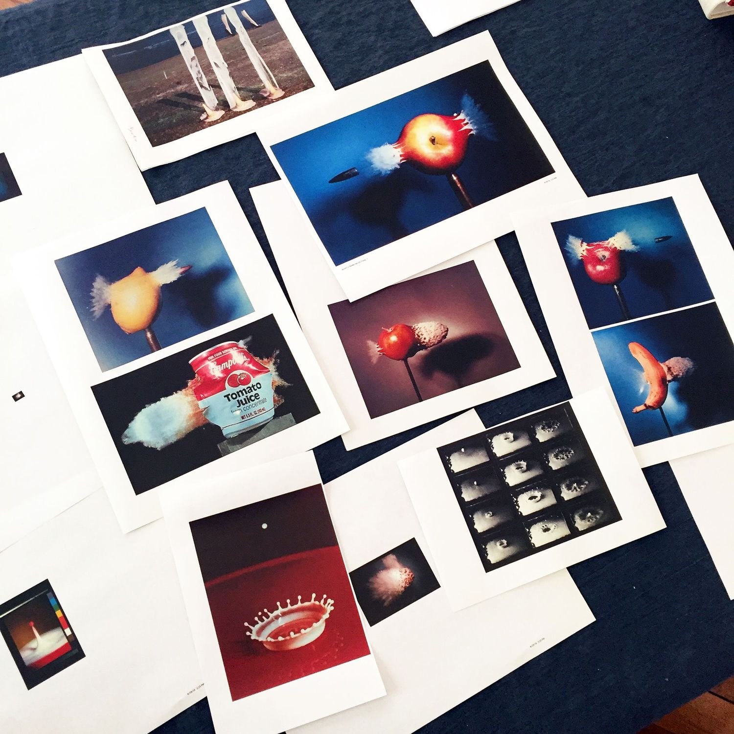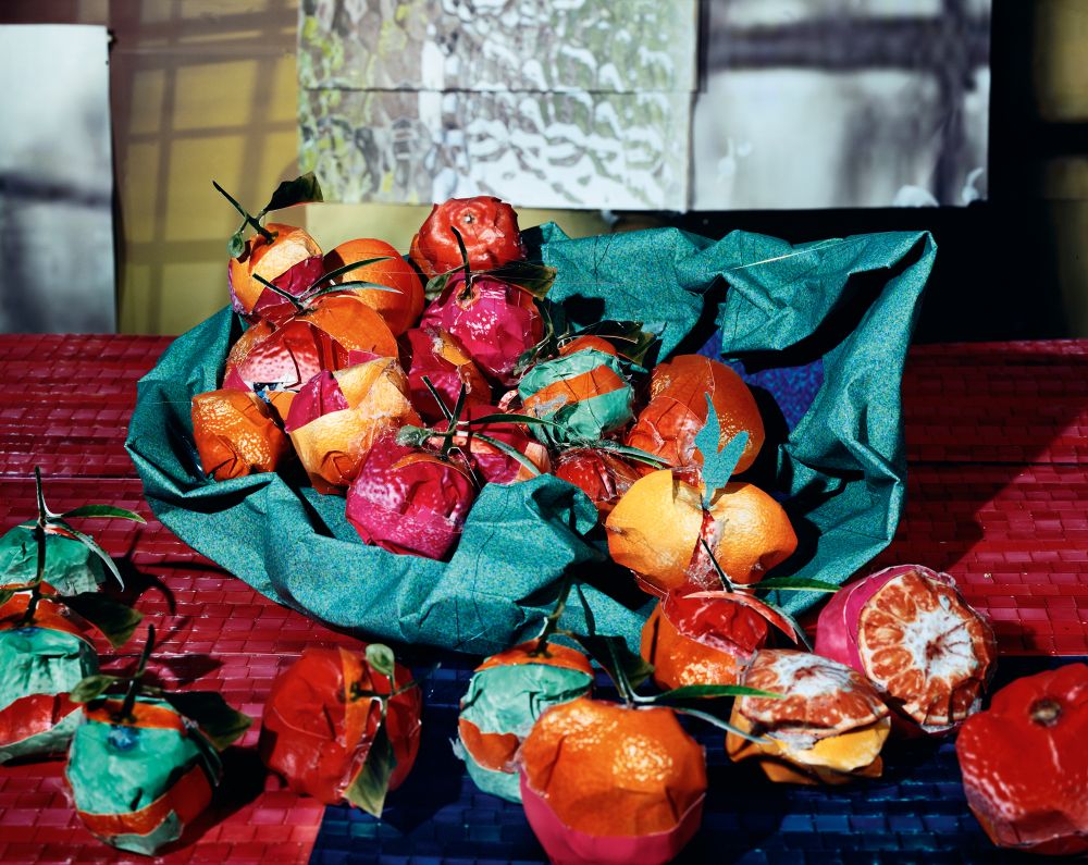 The show opens with a mouthwatering collection of still lifes by an array of different artists, stretching all the way back to the medium’s early days to more recent work. Several years after the birth of photography, William Fox Talbot took the first photograph of a basket of fruit, signalling the beginning of the medium’s longstanding love affair with food. Initially, photographic still lifes borrowed from the symbolism and traditions of painting, before photographers really began to explore the particularities of their own medium. Pioneering artists such as Paul Strand and Edward Weston used fruit and vegetables to play with light and form, while Howard Edgerton’s iconic image of a bullet shooting through an apple experimented with motion, using an electronic flash he invented himself. Building on the conventions of the genre, the photographic still life forged its own exploration of time and space—one that lives on in the work of Daniel Gordon. In his dizzying, vibrant arrangements, real pieces of fruit are replaced with a mix of 2D and 3D found images of fruit, toying with perspective, texture and color.