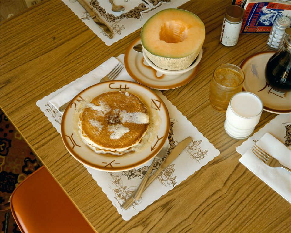 ‘Around the Table,’ the following room, focuses on food as a marker of identity—whether personal, familial, cultural or political. The dining table, in whatever shape or form it takes, is a space where notions of status, excess, scarcity, desire and social habits play out. And here, photography’s dual power to both construct and shape our values and represent a grittier reality can be viewed side by side, against the backdrop of vernacular snapshots. Nickolas Muray’s bright and inconceivably perfect commercial images depict decadent food spreads, harnessing post-WW2 aspirations and ideals, while pages from Betty Crocker’s infamous cookbooks speak to wholesome family values and the spirit of the American Dream. A very different picture of American culture can be seen in Stephen Shore’s ordinary pancakes and melon. Banal and everyday, the snapshot-like photo speaks of lonesome diner meals, of a life on the move, and of popular culture.