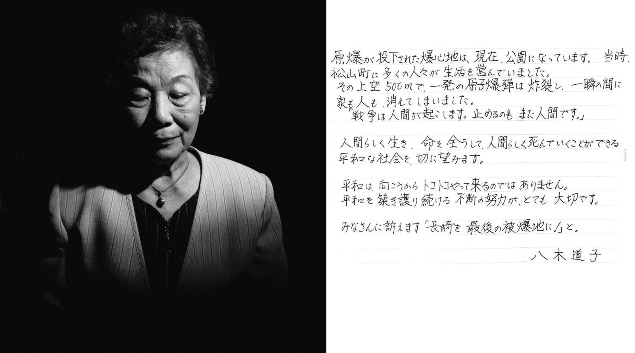This background set the stage for Sakaguchi’s current—and ongoing—project on the hibakusha, “1945.” A series featuring the victims of the atomic bomb attacks in Hiroshima and Nagasaki, “1945” is a collection of interviews (conducted by Sakaguchi) and black-and-white portrait photographs that offer firsthand accounts of the bombs’ devastating impact and aftermath. During her interviews with the victims, Sakaguchi also asks the survivors to write letters directed to future generations; these letters are then placed adjacent to the portraits in a diptych format. An English translation is available in the image’s caption.