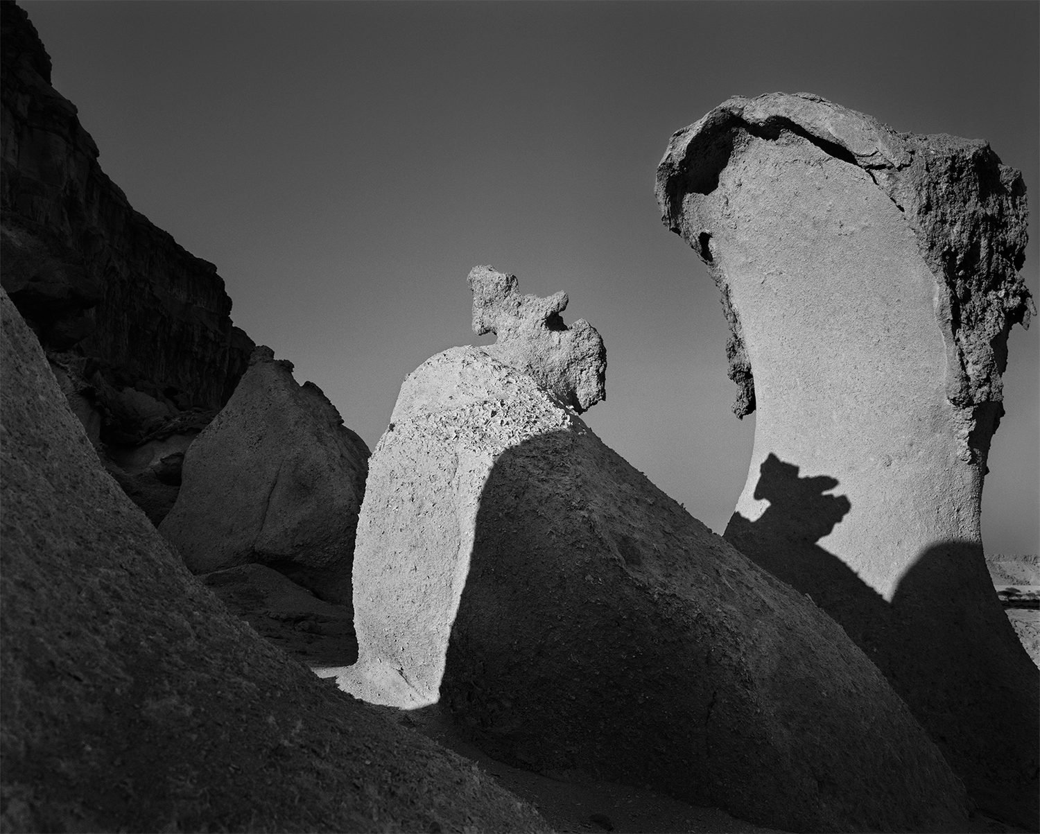 Interestingly, I am drawn to using the word ‘alien’ to describe these landscapes, and certainly in these monochrome representations they do appear strange and otherworldly. However, it is worth noting that alien is also a term we use for migrants, foreigners, outsiders, and refugees. As Michael Taussig’s short essay at the end of Speak the Wind tells us, these islands in the Persian Gulf are implicated in the history of the African slave trade, particularly the movement of slaves from northern and eastern Africa. And it is from this diaphonic Afro-Iranian legacy that the beliefs, traditions and ceremonies of the Zār are drawn and continue to this day.