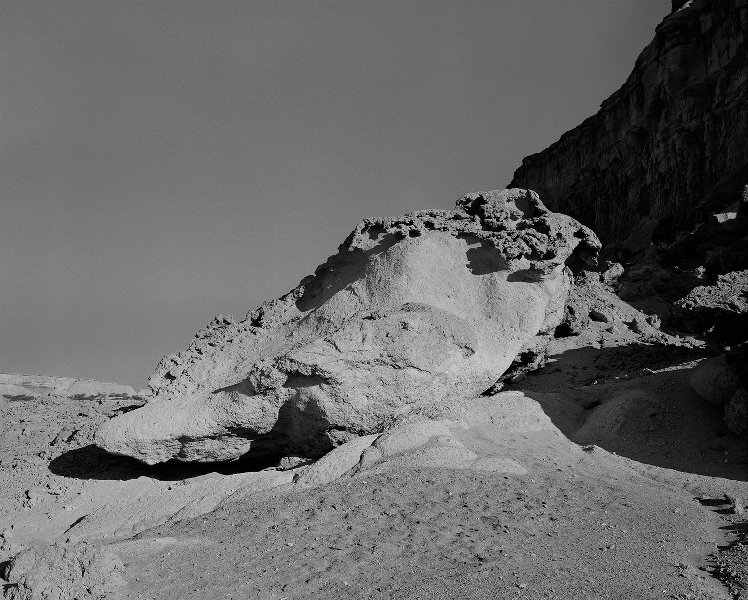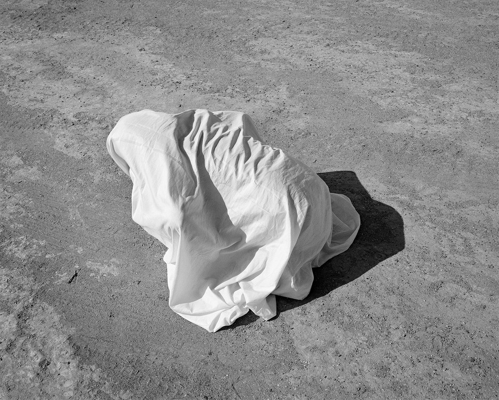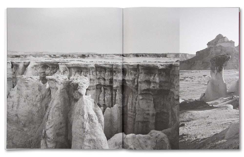 Hidden within some of these monochrome scenes are line drawings made by Afshar’s local collaborators; drawings of creatures, the stuff of nightmares, these are the Zār— the spirit-wind that possesses peoples’ bodies according to local beliefs. Later in the book, we briefly see a figure hidden under a white sheet, located amongst the black and white landscapes. They seem to writhe and twist as if in pain, the camera moves in closer and the covered, possessed form almost fills the frame, and then just as quickly we return to strange rock formations of the stark landscape.