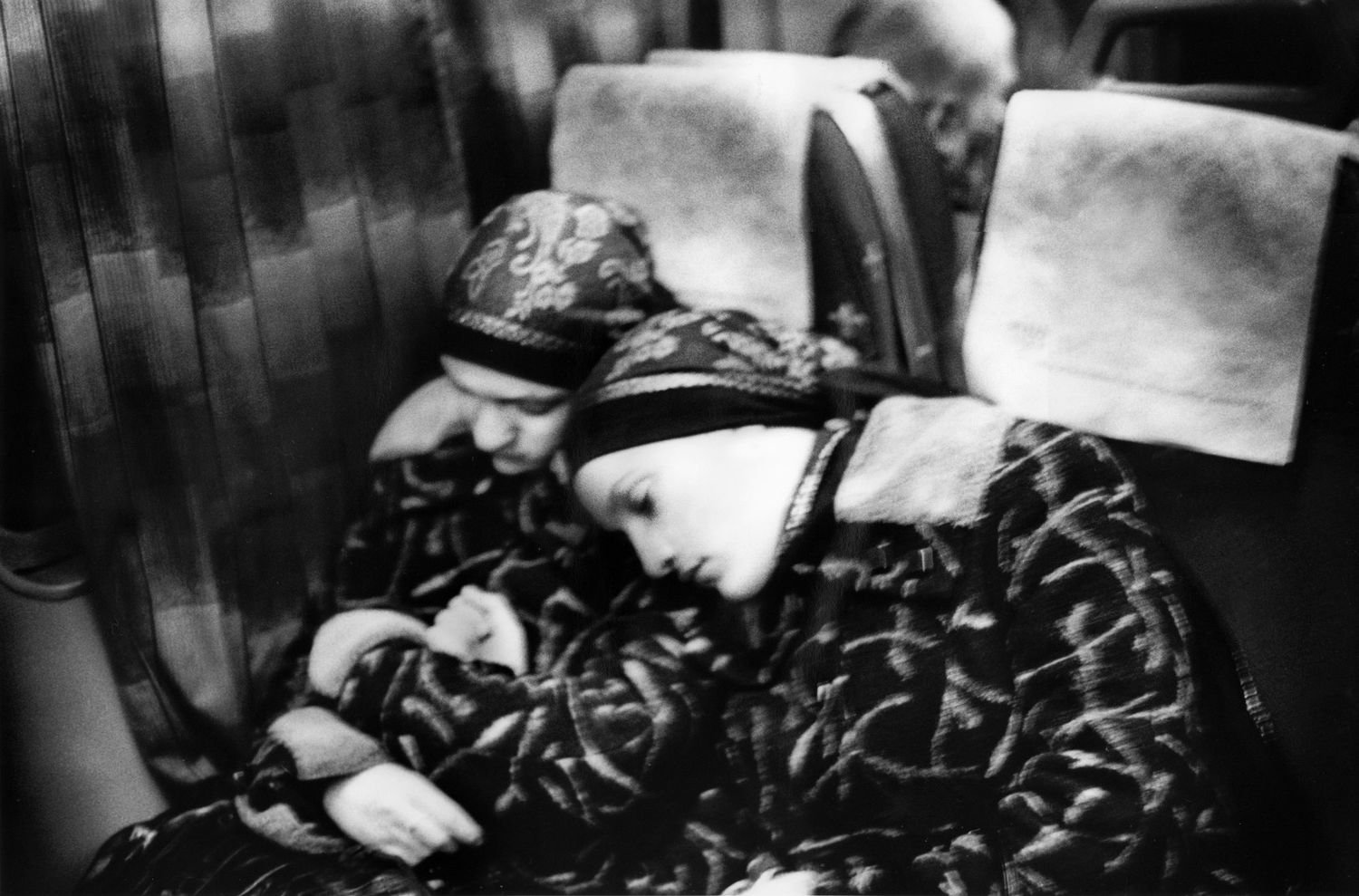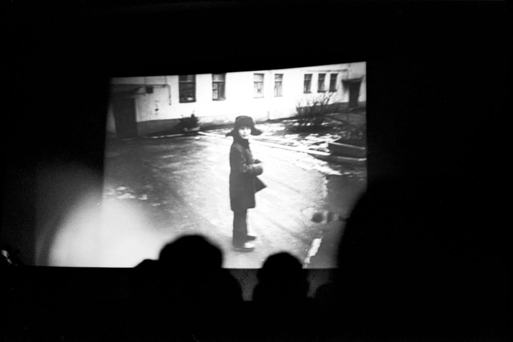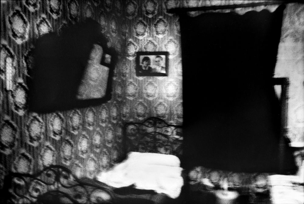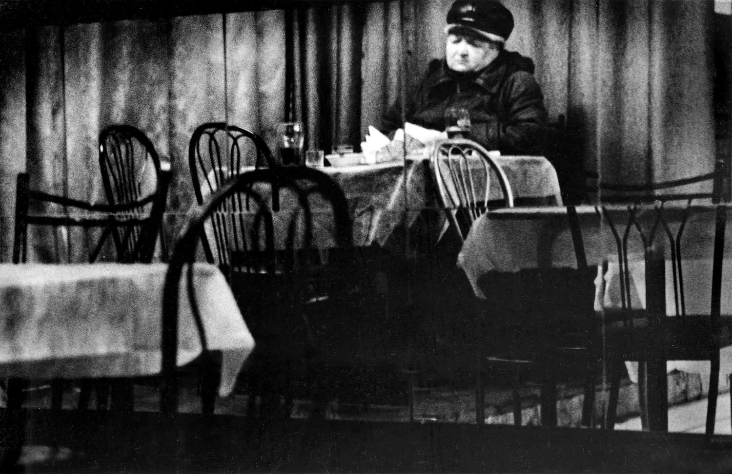 The aesthetic is reminiscent of Daido Moriyama’s rough, obscure, out of focus are-bure-bokeh vernacular born on the streets of Tokyo, but Posner, unlike Moriyama, is no provocateur. His gaze doesn’t shock; it distills a private transcendence, one that relies on memory for its thrust. The artist’s longing to transcend the now coheres in the streaks of nocturnal sky, in the reflections of the flash bouncing against the snow, in the crumbling facades, in the murky interiors of Soviet communal flats, in photographs of old photos and frozen cinema frames. The past leers from everywhere. Ruins abound. Men buy their eternal drink at the kiosks. A trashed TV set sits on the stairwell. At night, on the playground, the rocket-shaped slide, ubiquitous in the USSR, points its fuselage into a communist future that never arrived.