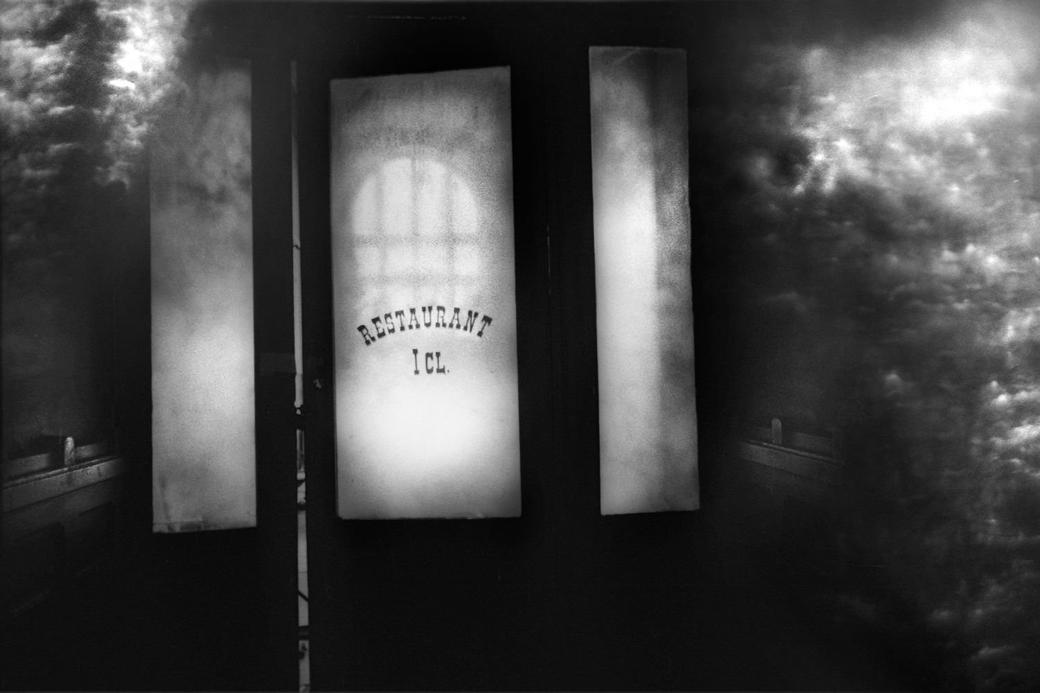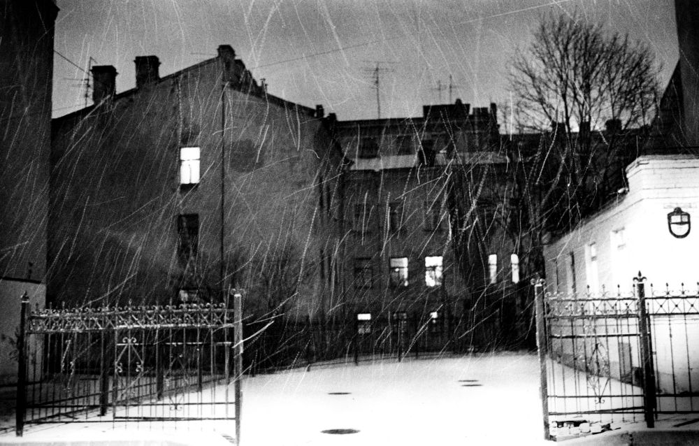 Posner’s book charts an uncanny urban topography, an alternate universe born from a private dialogue with the city. Take the image of the luminous threads of snow falling at night by the entrance of an old-style apartment building. The gates are flung open. The lit windows are slightly out of focus. Antennas and barren branches reach towards the dark lead of the sky. Bright strings of snow keep time as they fall. The tableau is steeped in unreality. The moment of returning, whose impossibility is its very allure, has become a phantasmagoria.