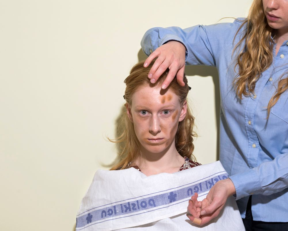 Szwarc’s take on the (self-)portrait is complicated by her “supporting role” in many of her photographs. These images shake the viewer loose from their comfortable seat: no longer are we looking at a direct representation of the artist. Instead, we watch as Szwarc dabs face paint over her model, obscuring her physical features and seemingly changing her character before our eyes. It feels oddly intimate, as if we’ve entered Szwarc’s mind and we’re watching her as she fiddles or experiments with aspects of her identity.