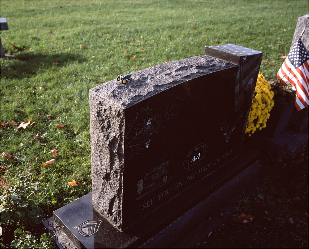 Throughout the course of Next of Kin, Abergil quietly lays out the aftermath of military deaths in a series of images and interviews that resonate with grief and deep desolation. The book delves into the ways that families in America preserve the memory of loved ones killed in combat. Much of Abergil’s artistic practice focuses on the aftermath of war—her previous series “Nothing Left Here But the Hurt” chronicles public monuments of war and trauma. Next of Kin, then, is the private continuation of this investigation. As in “Nothing Left Here But the Hurt,” there are very few people in Next of Kin—the only image of another person (besides the occasional photo-of-a-photo) depicts a memorial tattoo that stretches across both forearms. Instead, Next of Kin pays tribute to the private altars, stuffed animals, and well-worn t-shirts that serve as tributes and totems, connections to soldiers who have passed away.